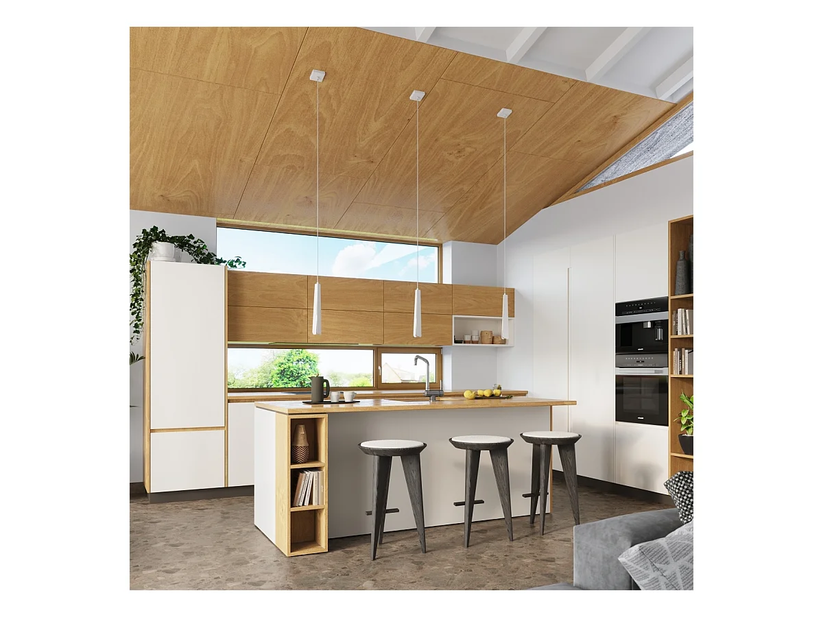 Suspension linéaire Torino en acier et bois avec 3 abat-jour cylindriques blancs 3xE27