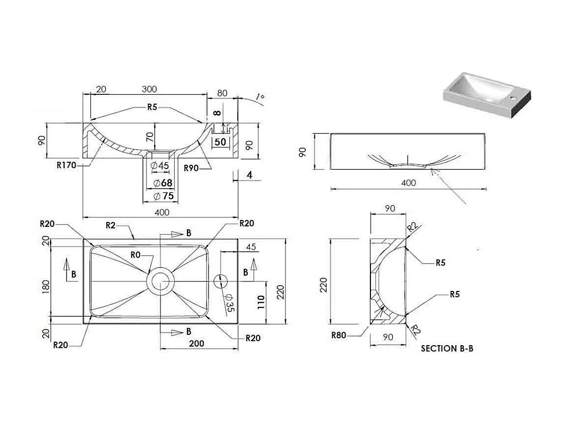 Lavabo 59,3x35,1x10,7 cm Fonte minérale/marbre Blanc