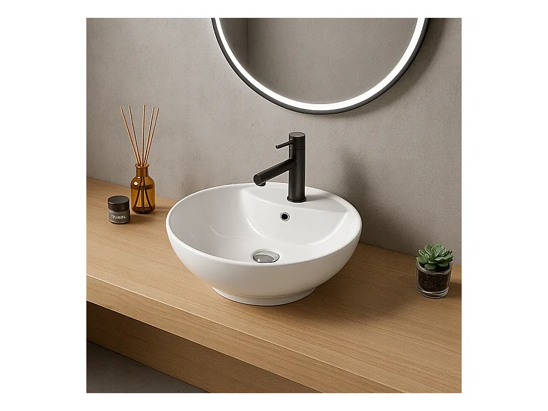 LAVABO À POSER OVALE EN CÉRAMIQUE BLANCHE BRILLANTE AVEC TROU DE DÉBORDEMENT