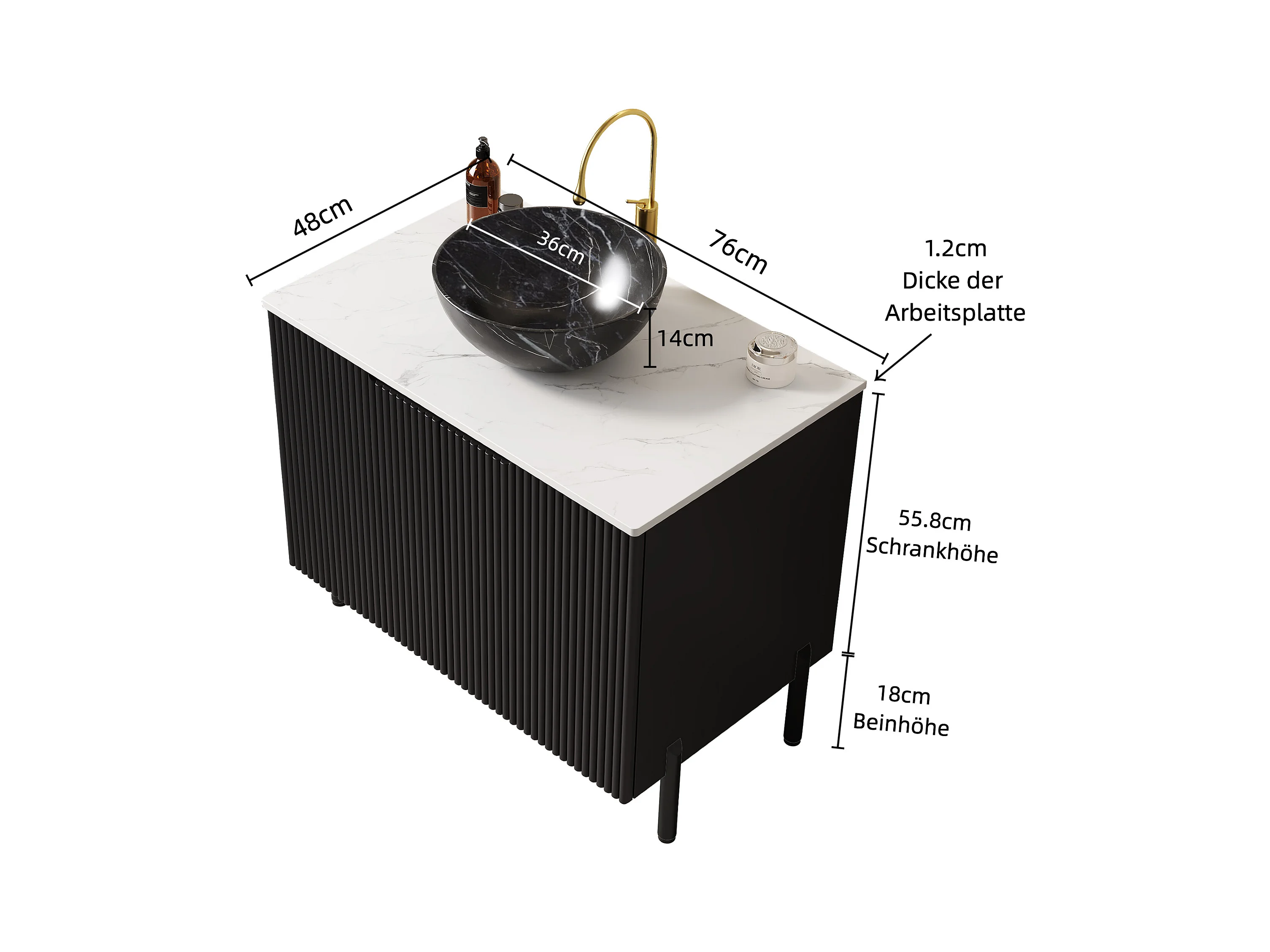 Lavabo de salle de bain indépendant avec évier noir à motif pierre, plan de travail en pierre synthétique blanc Carrara (76x48x89cm)