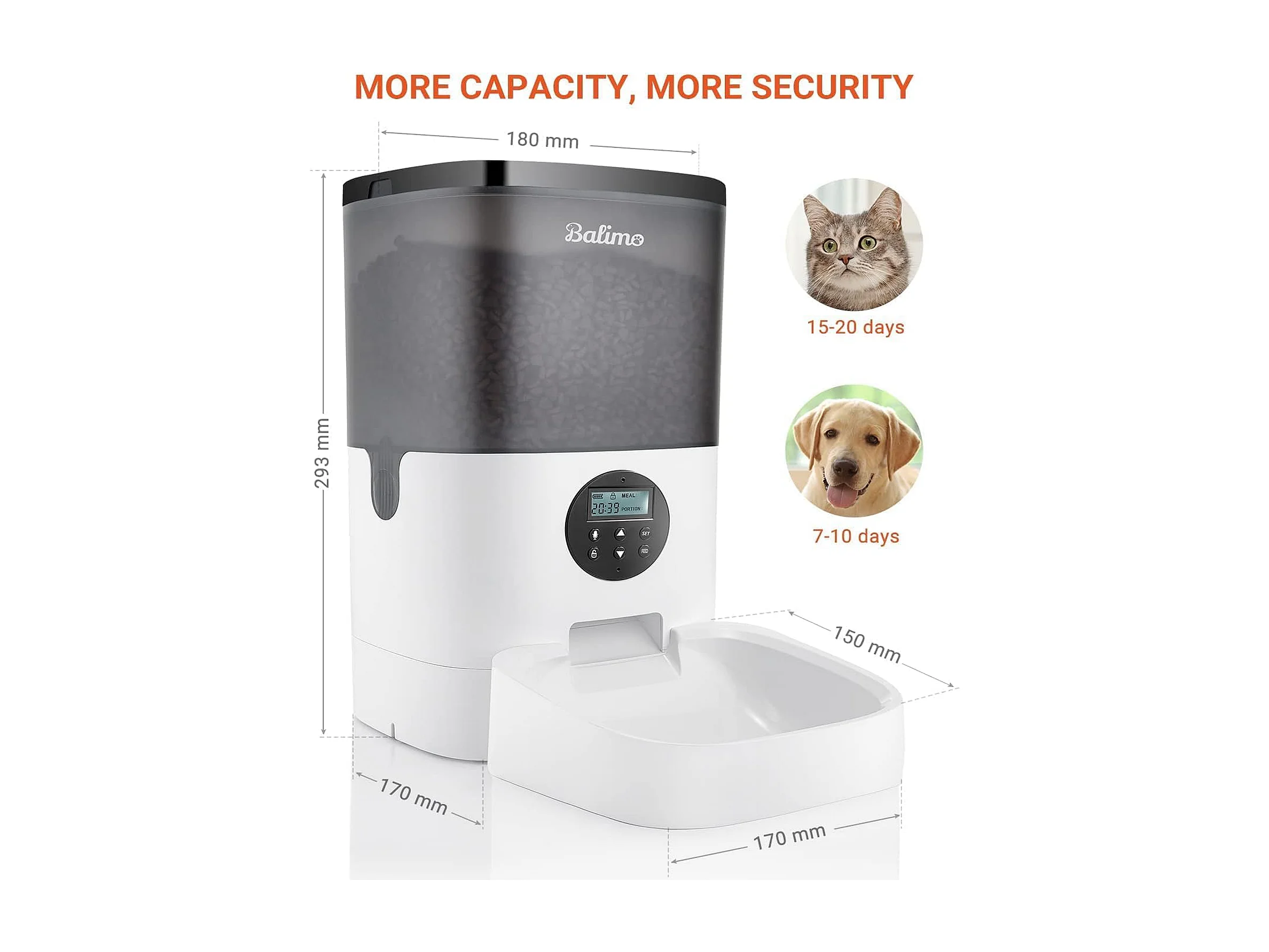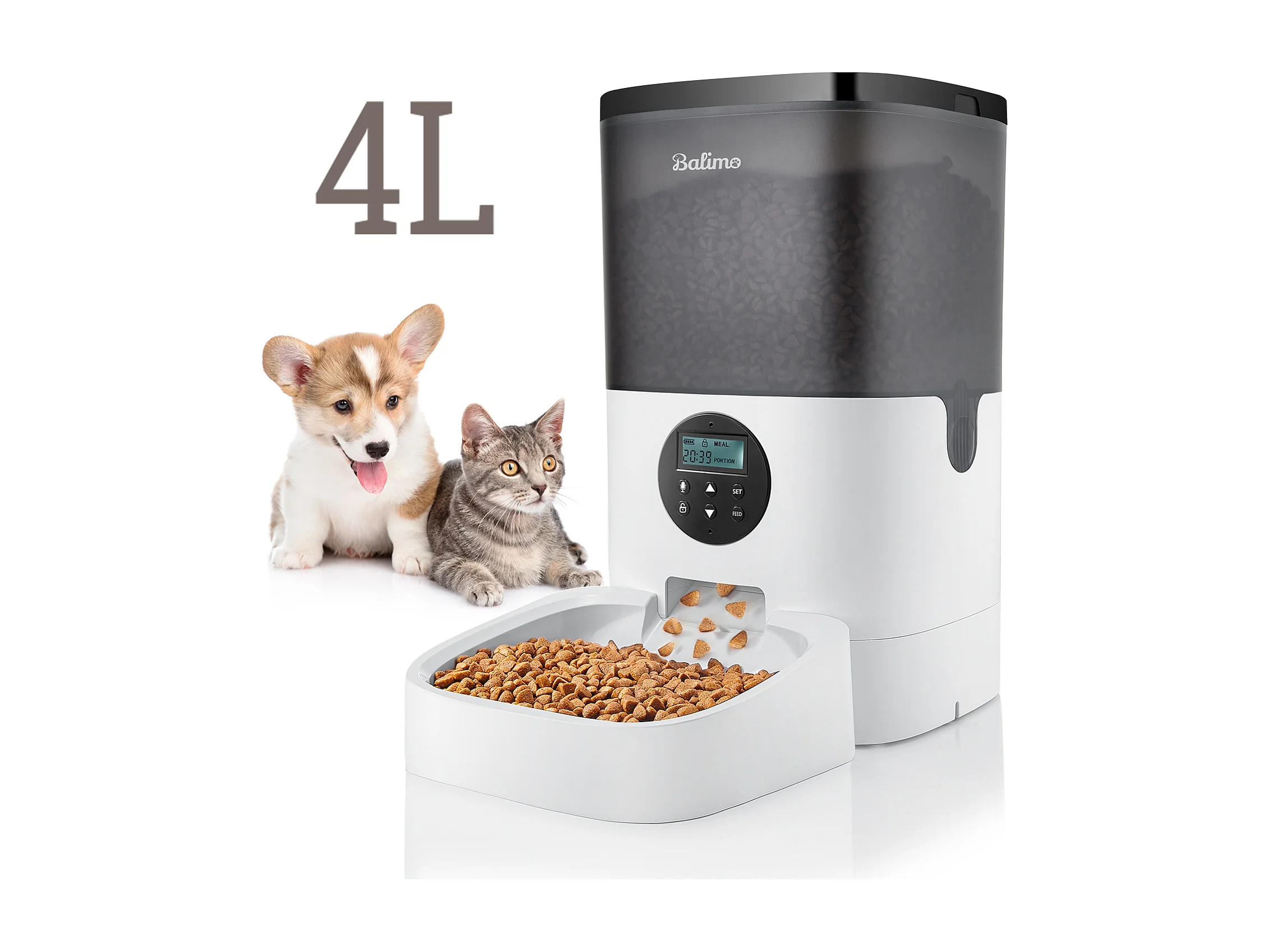 Balimo 4L Distributeur de Croquettes pour Chats/Chiens,avec Adaptateur Secteur / Batterie,Écran LCD, Enregistrement Vocal 10S et minuterie,Noir Blanc
