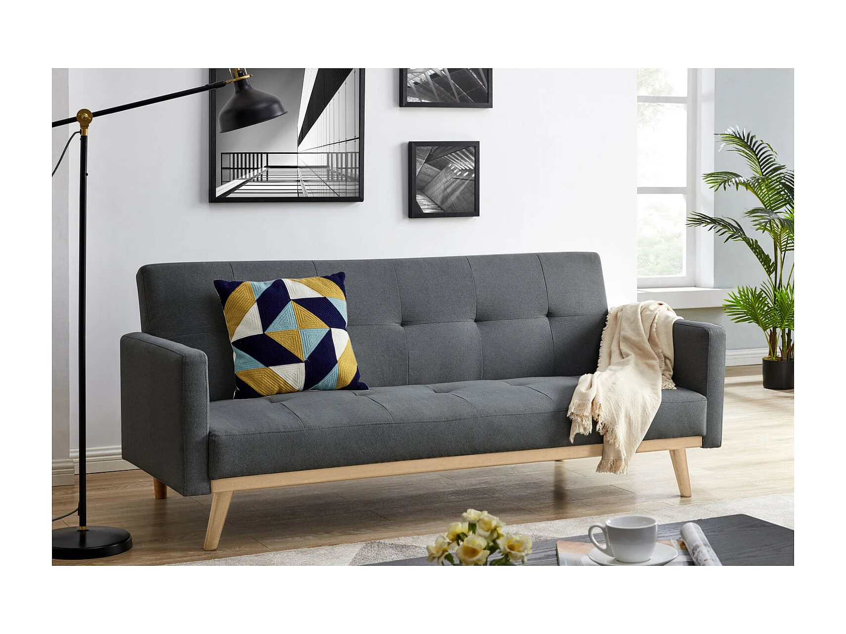 Canapé convertible 3 places en tissu gris foncé pieds noirs LEON