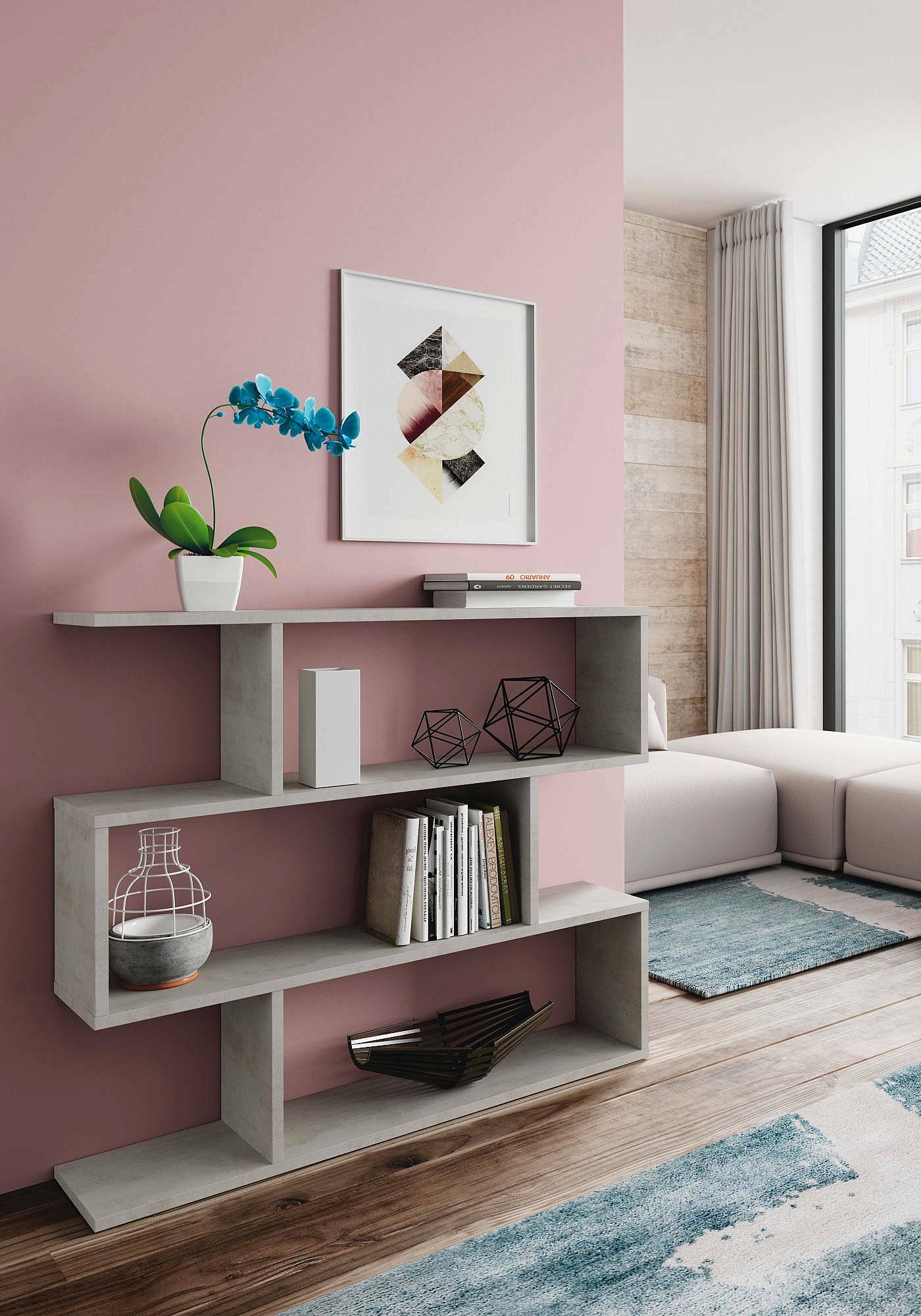 LIBRAIRIE - Bibliothèque basse double face, Étagère à trois compartiments, Étagère de bureau moderne, cm 110x24h97, Gris béton.
