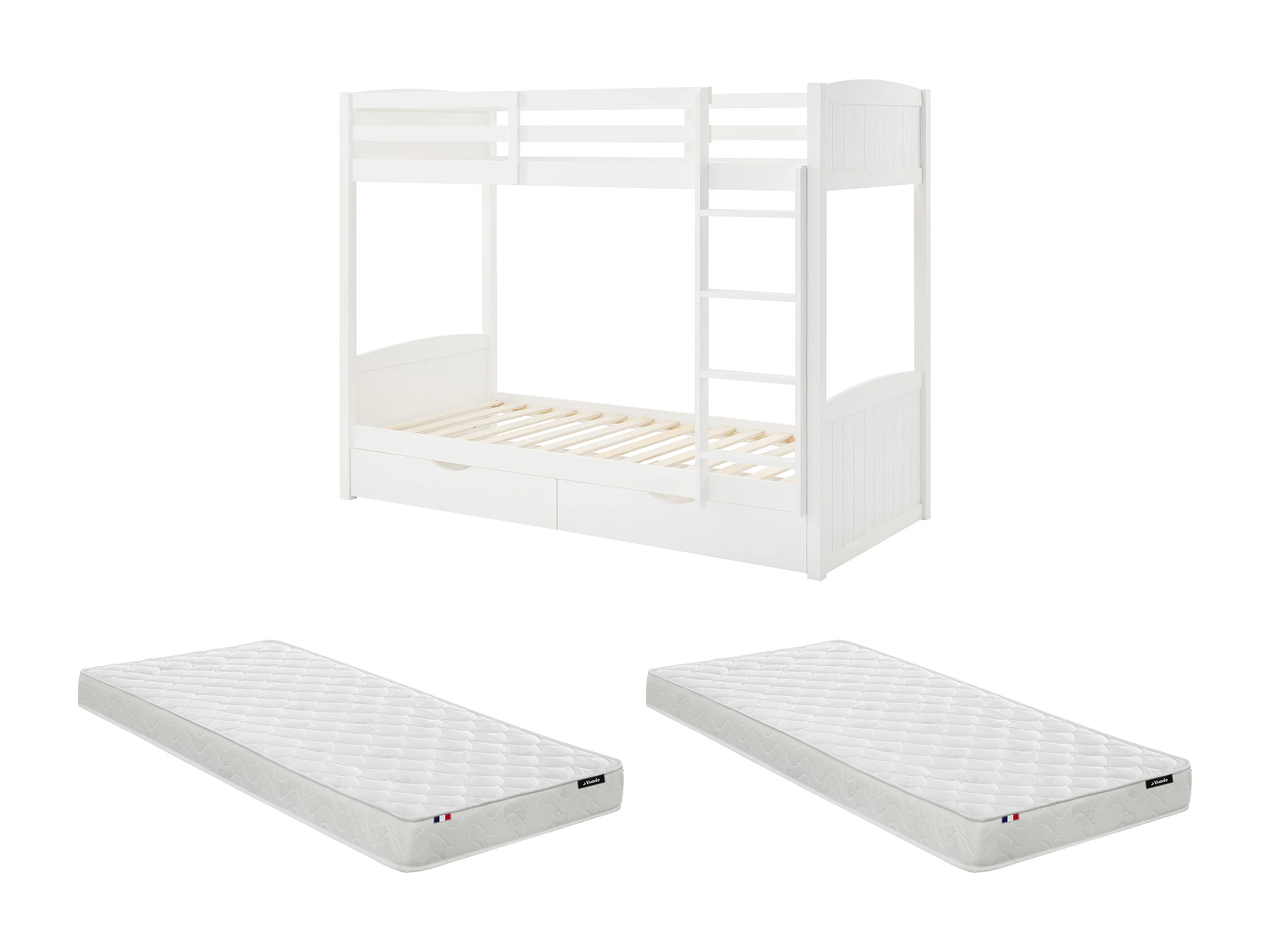 Lits superposés 2 x 90 x 200 cm - 2 tiroirs - Pin et MDF - Blanc + Matelas - LIMODARA