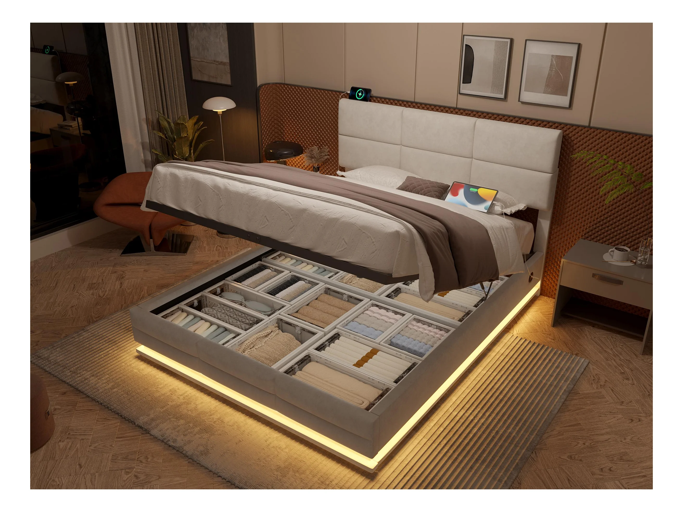 Lit Coffre 140×200 cm Velours Beige – Éclairage LED Multicolore - Ports USB+Type‑C - Rangement Sous Sommier – Style Contemporain