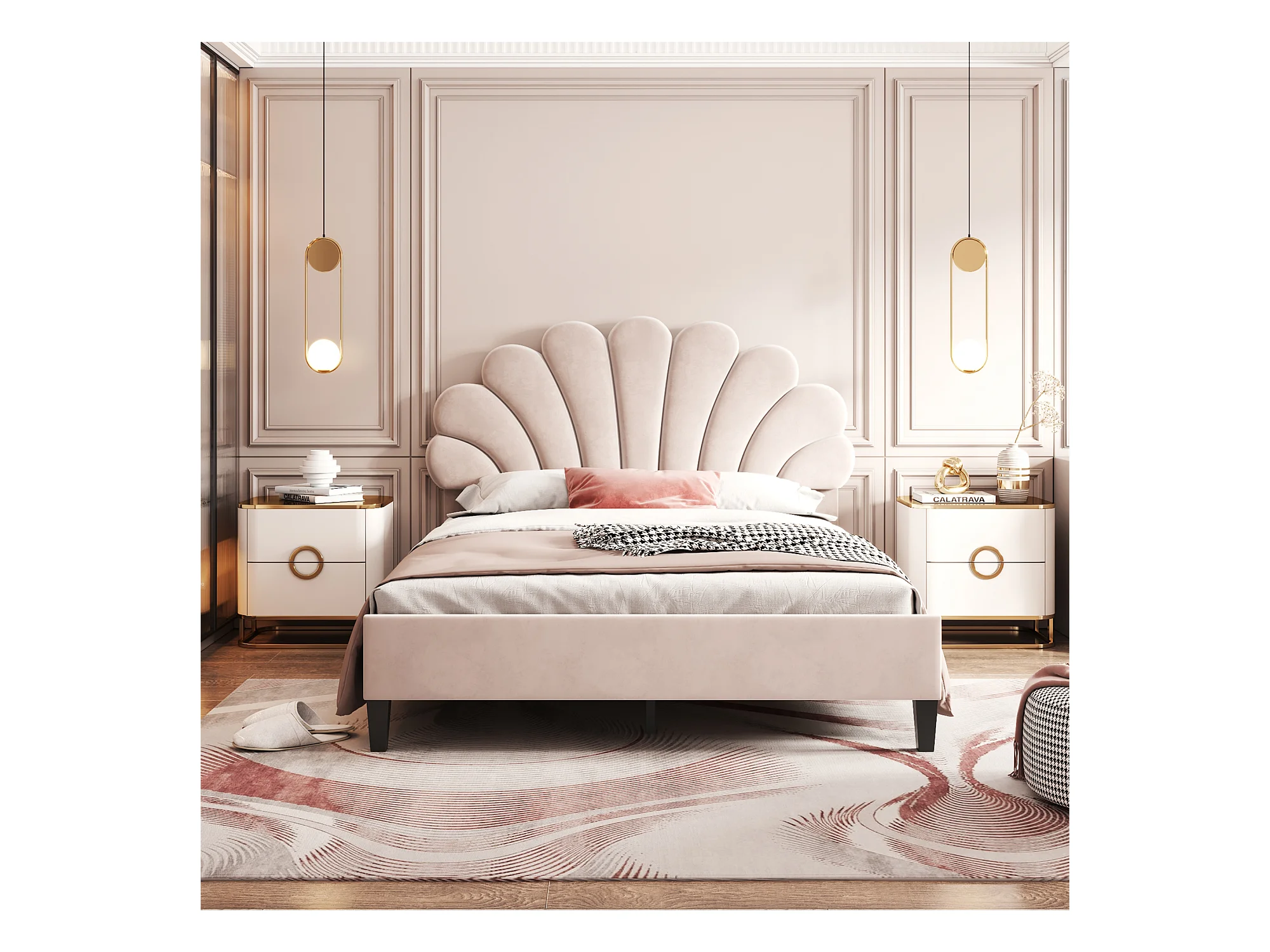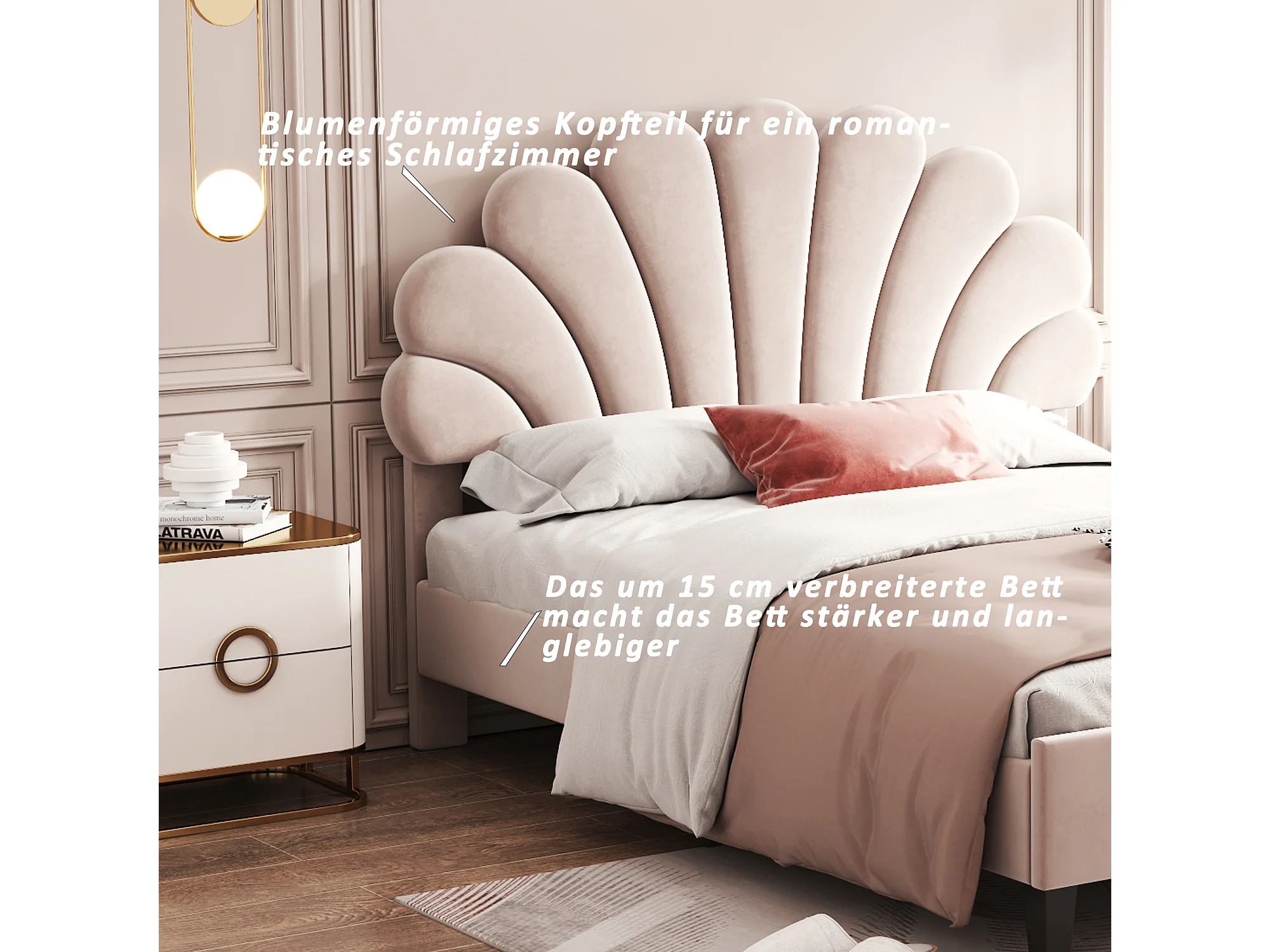 Lit 140 x 200 cm, Tête de Lit en Forme de Fleur, Cadre en Bois, Tissu Velours Beige (206 x 150 x 110.5 cm)