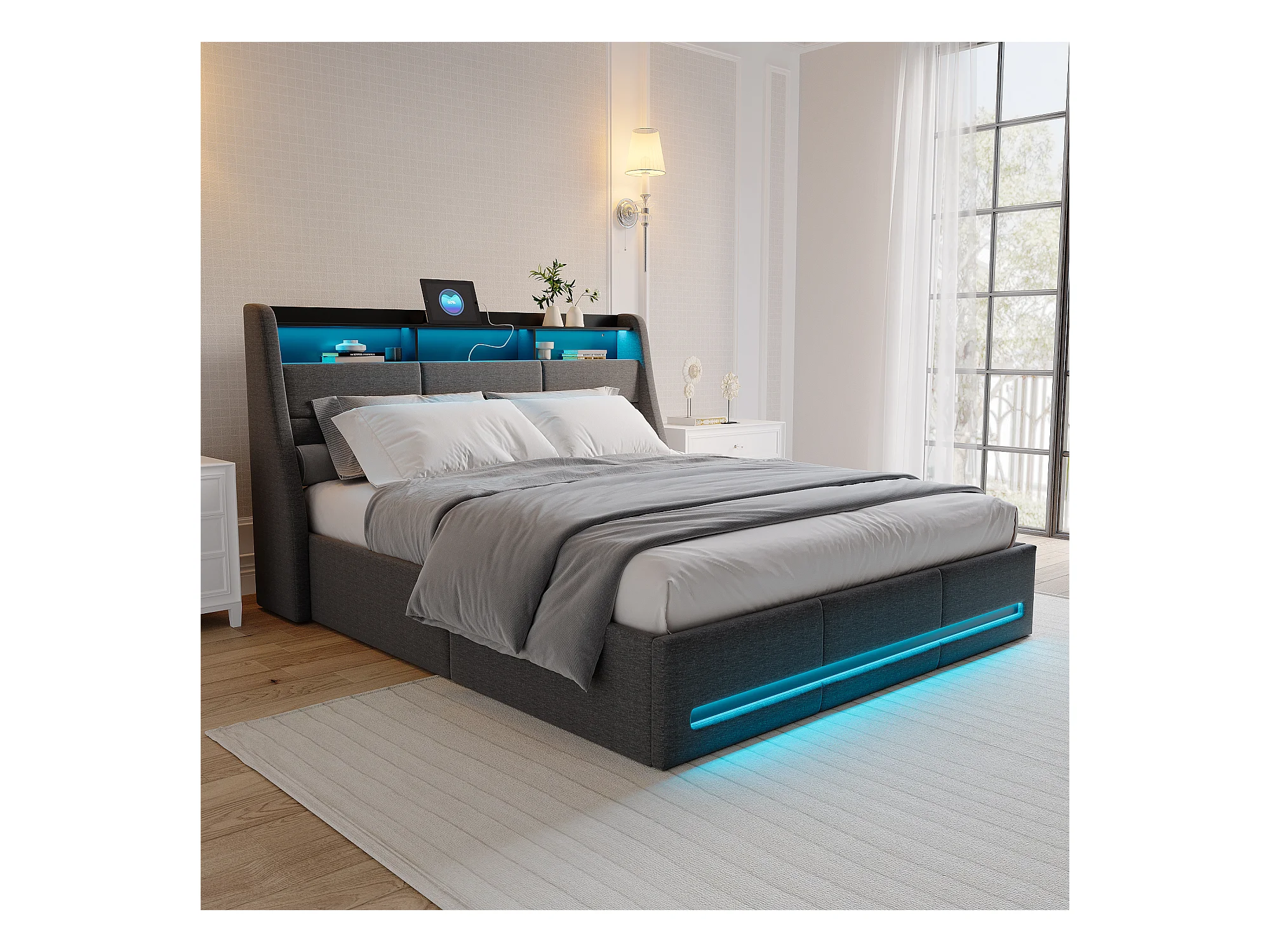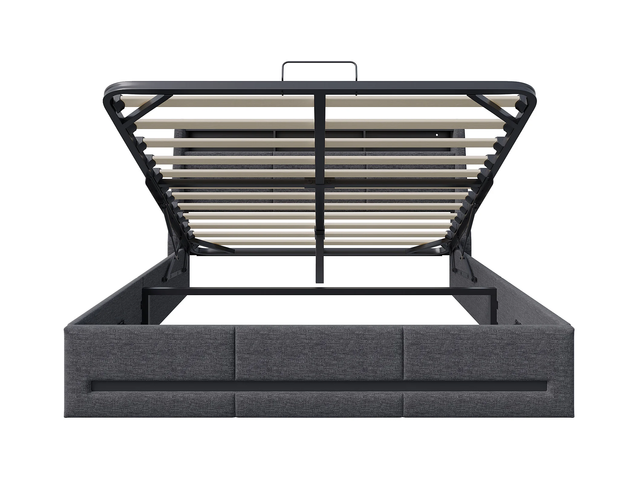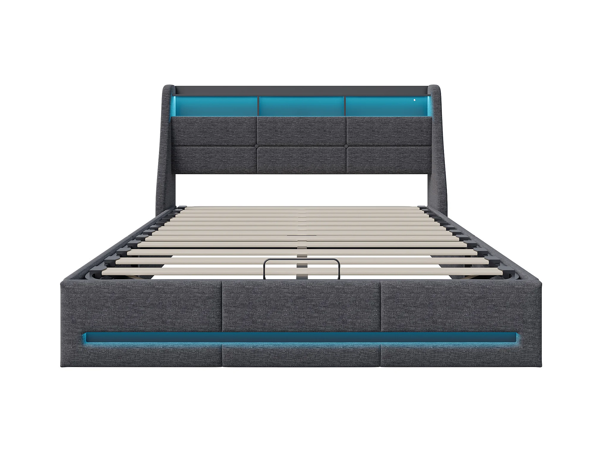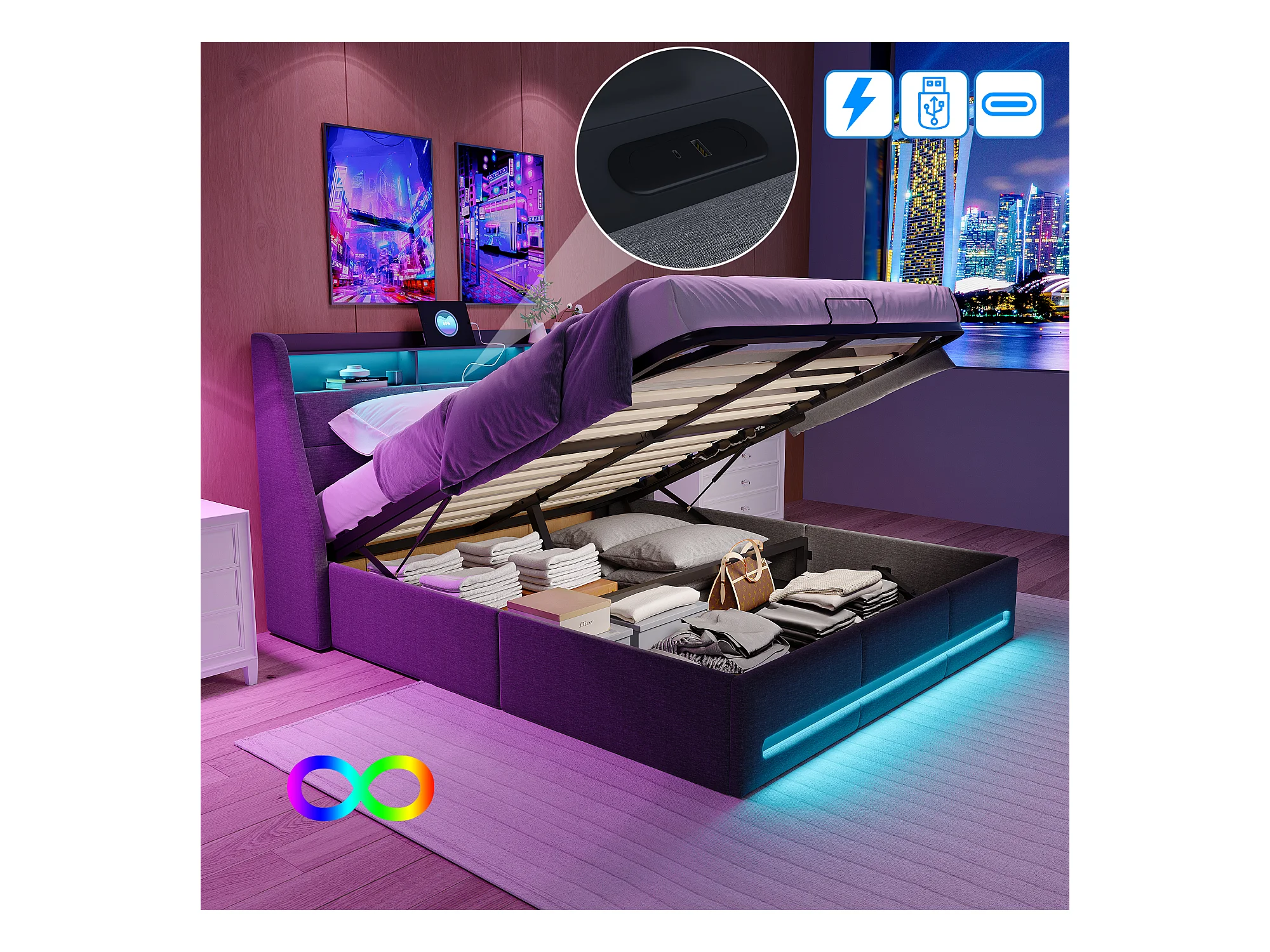 Lit 140x190 Avec Sommier LED Et USB, Lit Coffre Avec Rangement Et Tete De Lit, Gris