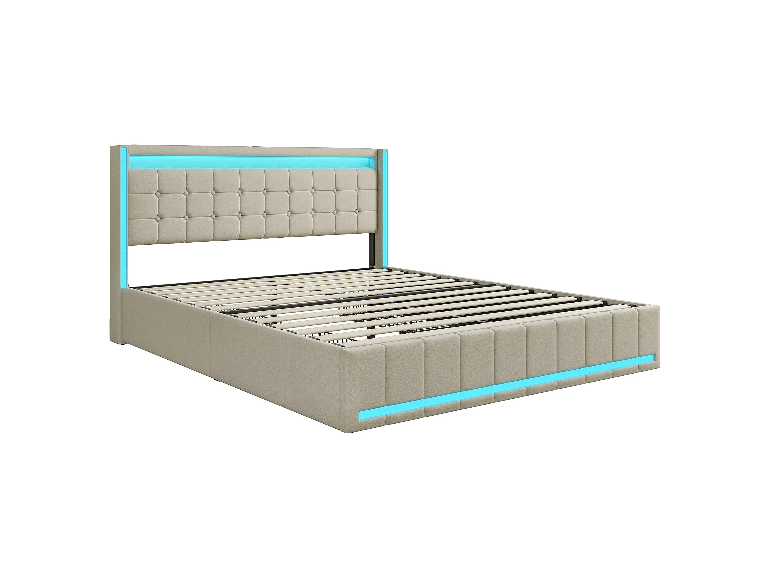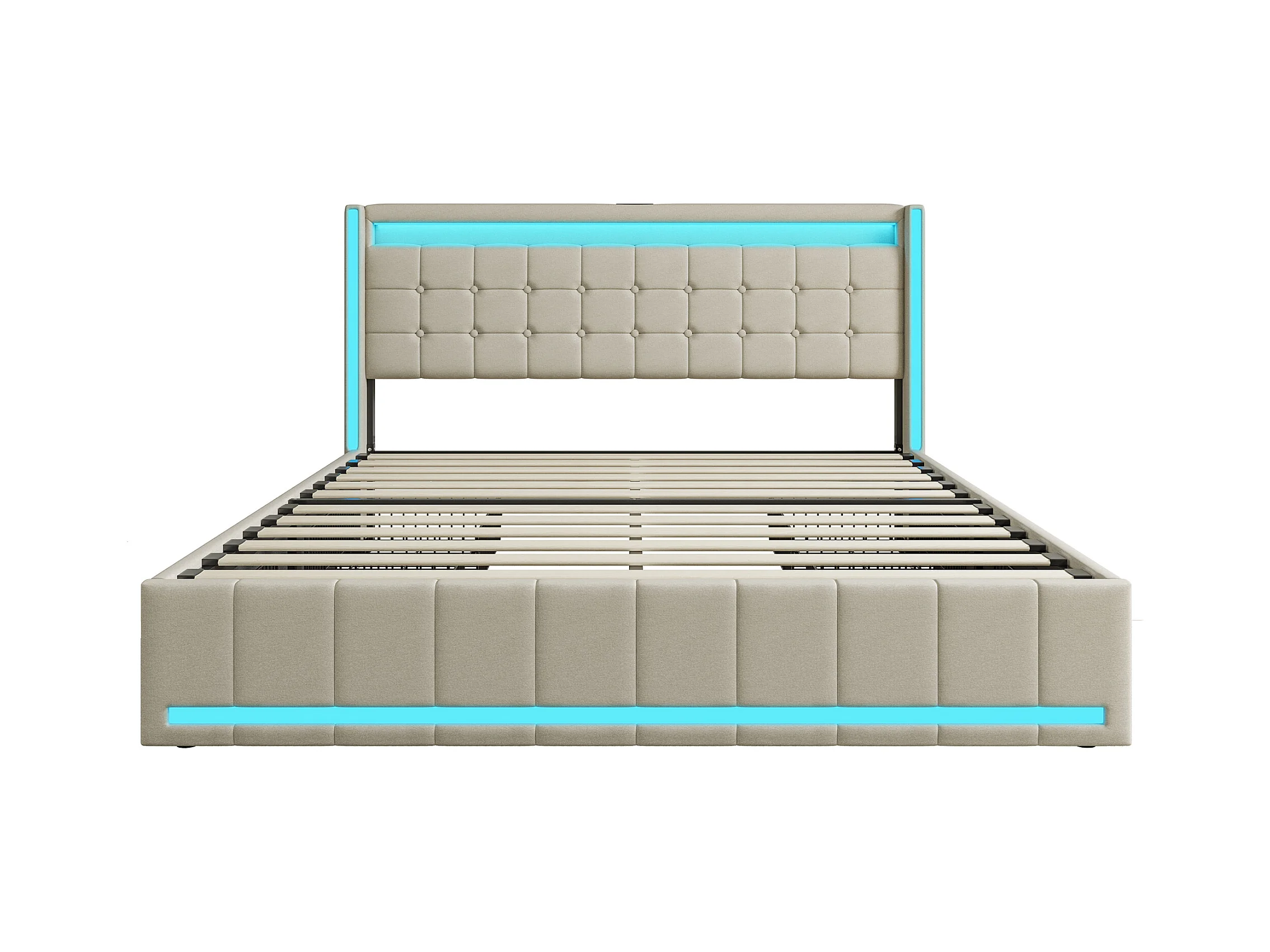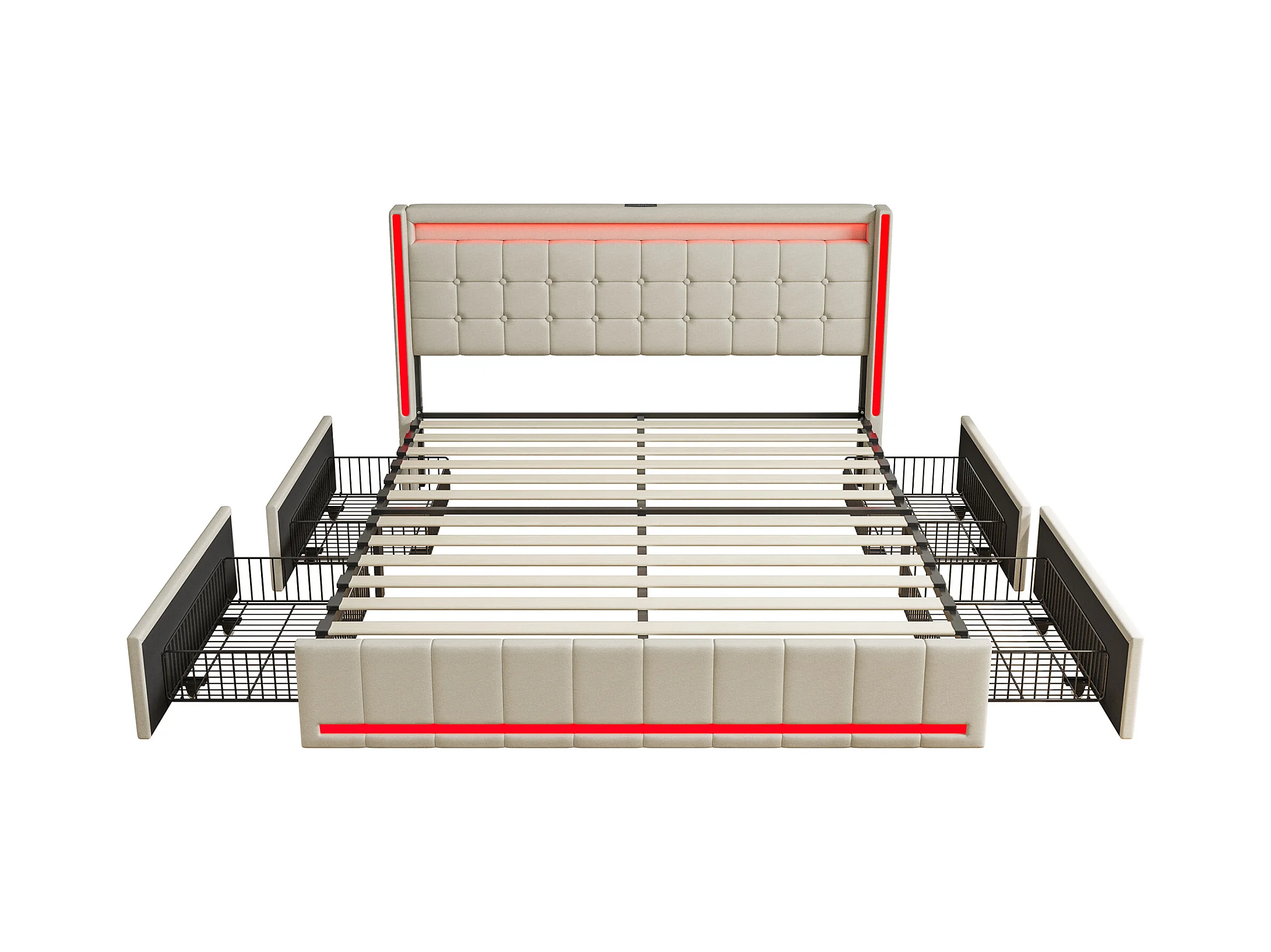 Lit 140x190 Avec Sommier LED Et USB, Lit Double Avec 4 Tiroirs, Beige