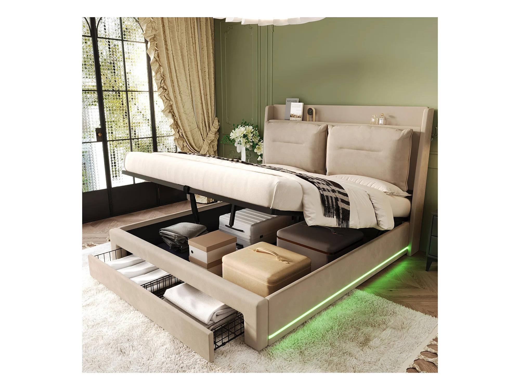Lit 140x190 hydraulique LED - Rangement 2-en-1 - Velours beige clair - Sans matelas