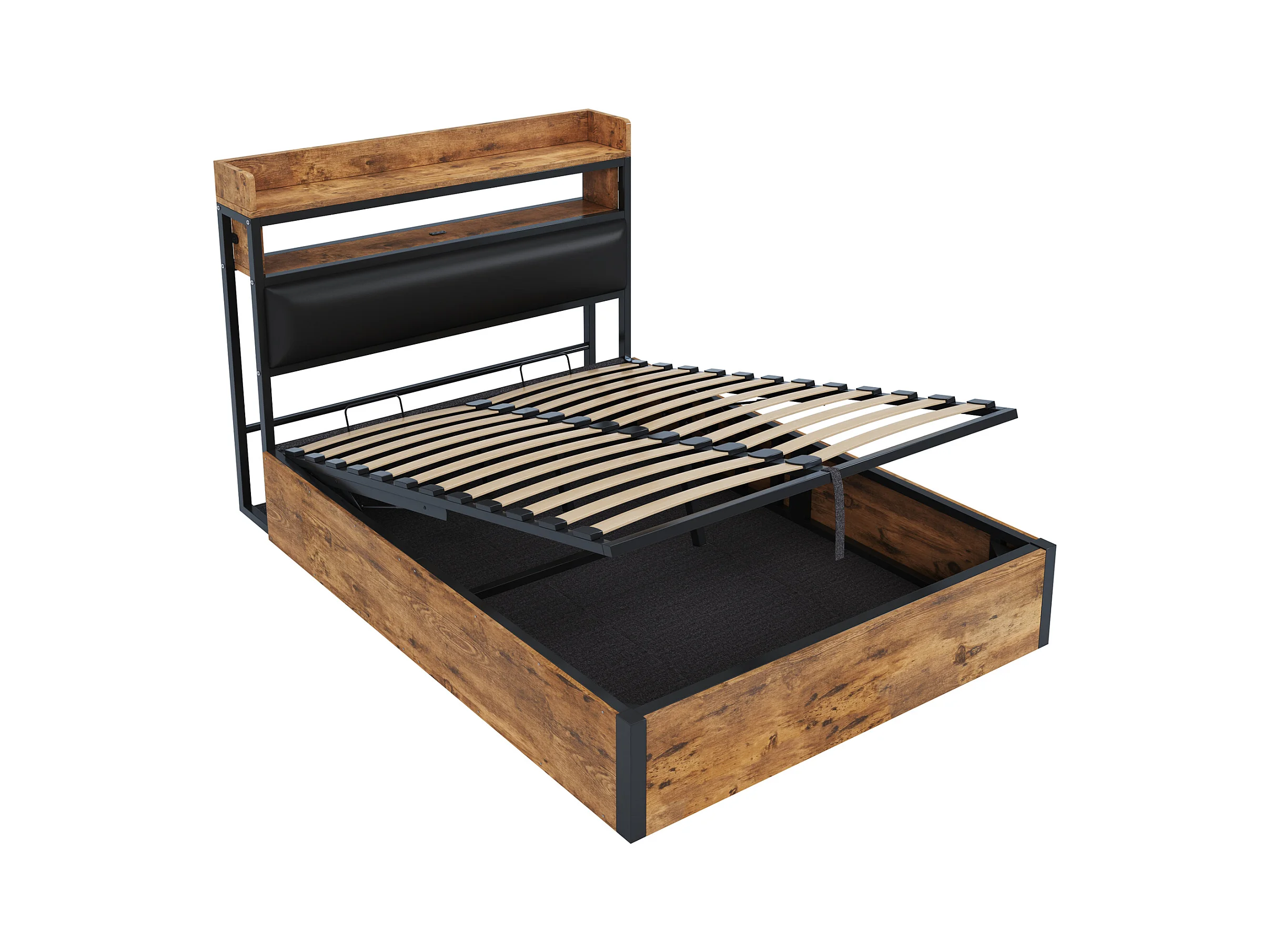 Lit métal avec rangement, tête de lit avec étagère, 3 ports USB, velours noir, MDF + métal, Noir + Noyer, 140x200cm