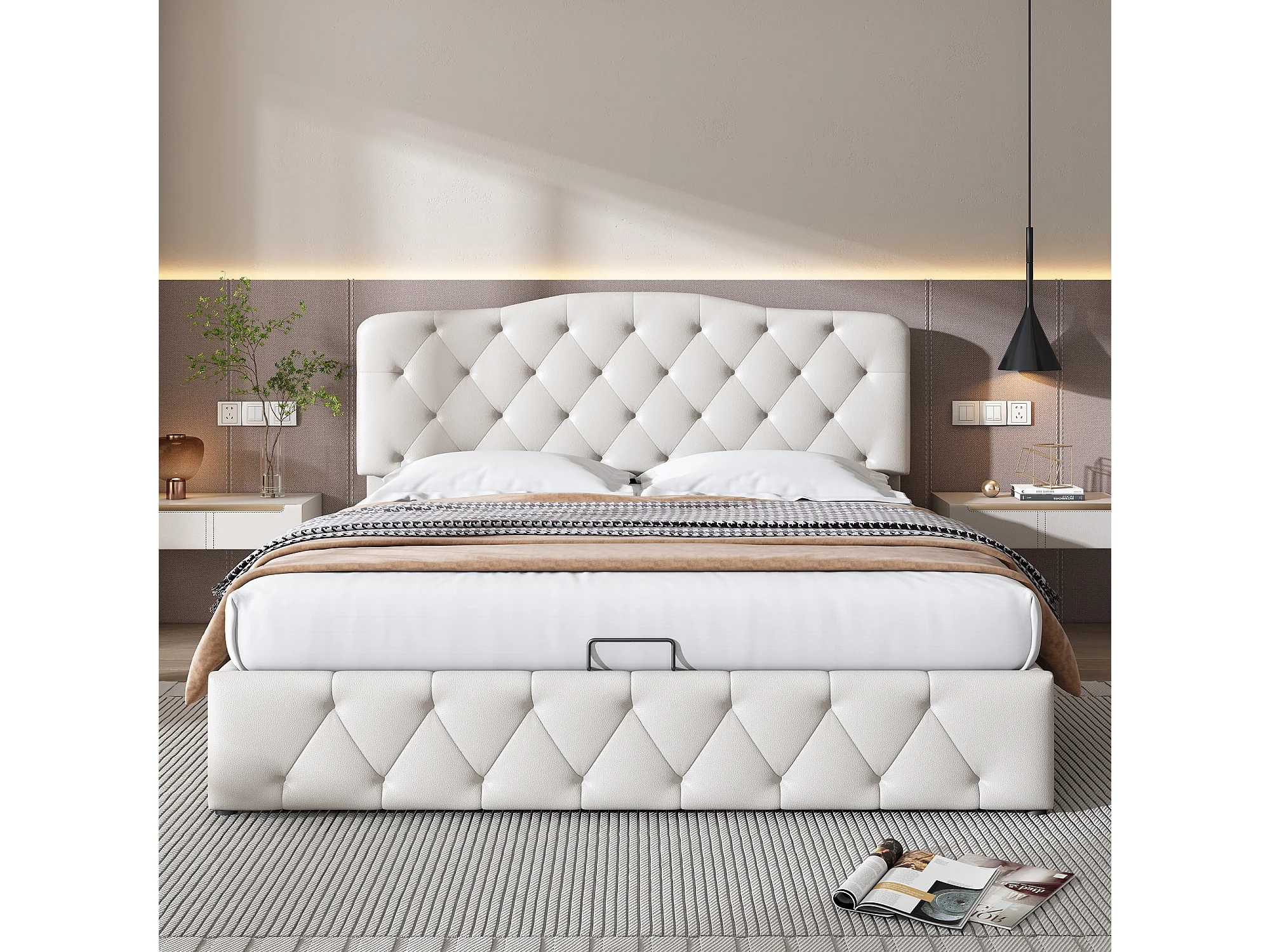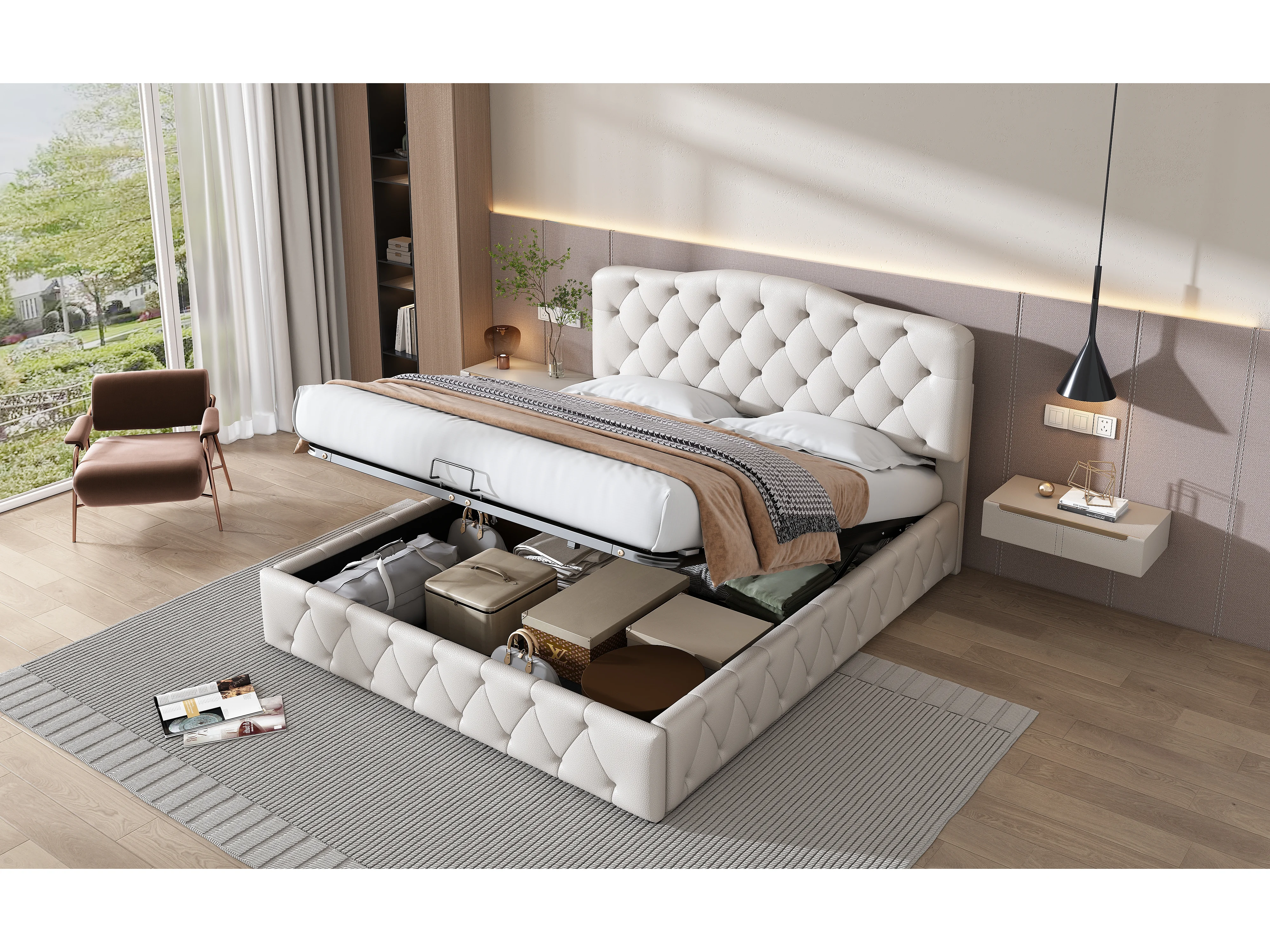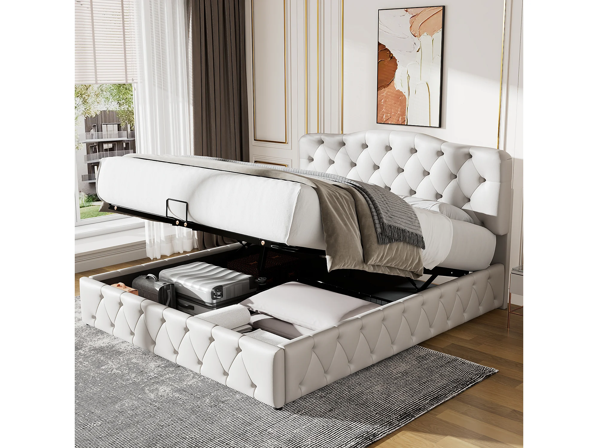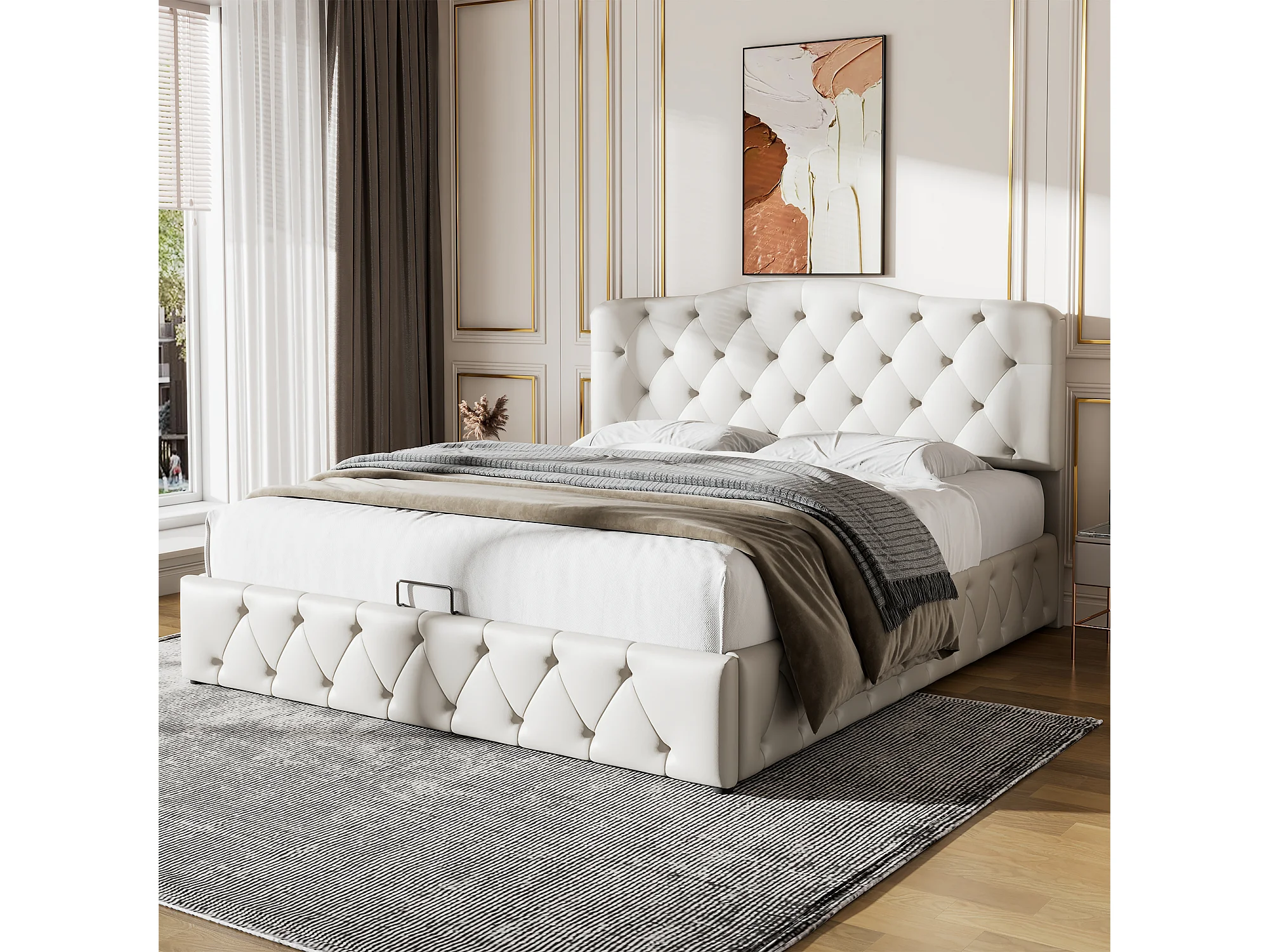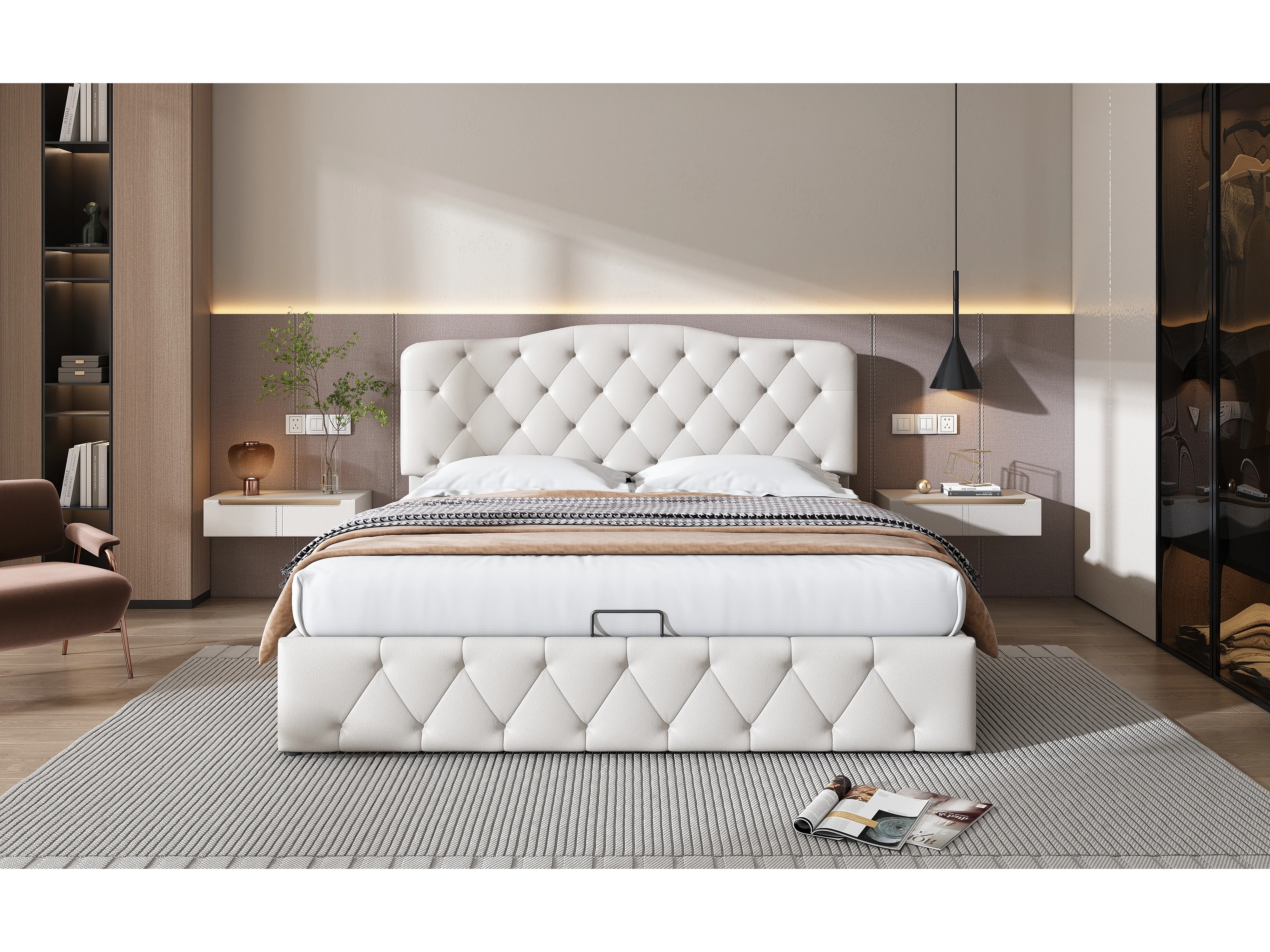 Lit 140x200 avec Tête de Lit Rembourrée, Hydraulique, Rangement et Nœuds Décoratifs, PU, Blanc (207x142x100 cm)