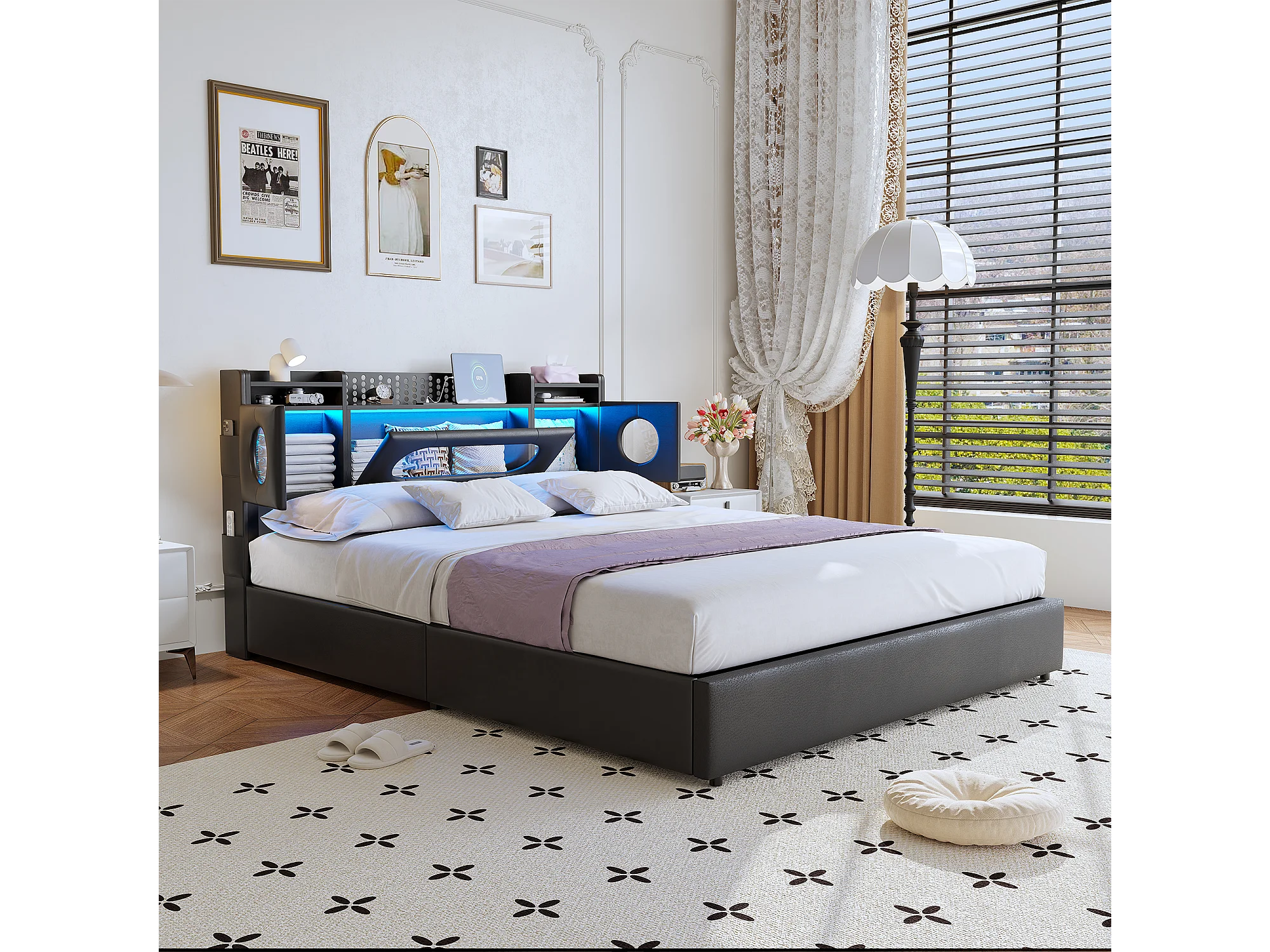 Lit 140x200 cm avec Rangement à Gaz, Ports USB/Type C, Éclairage LED et Tissu Lin - Pratique et Moderne,noir