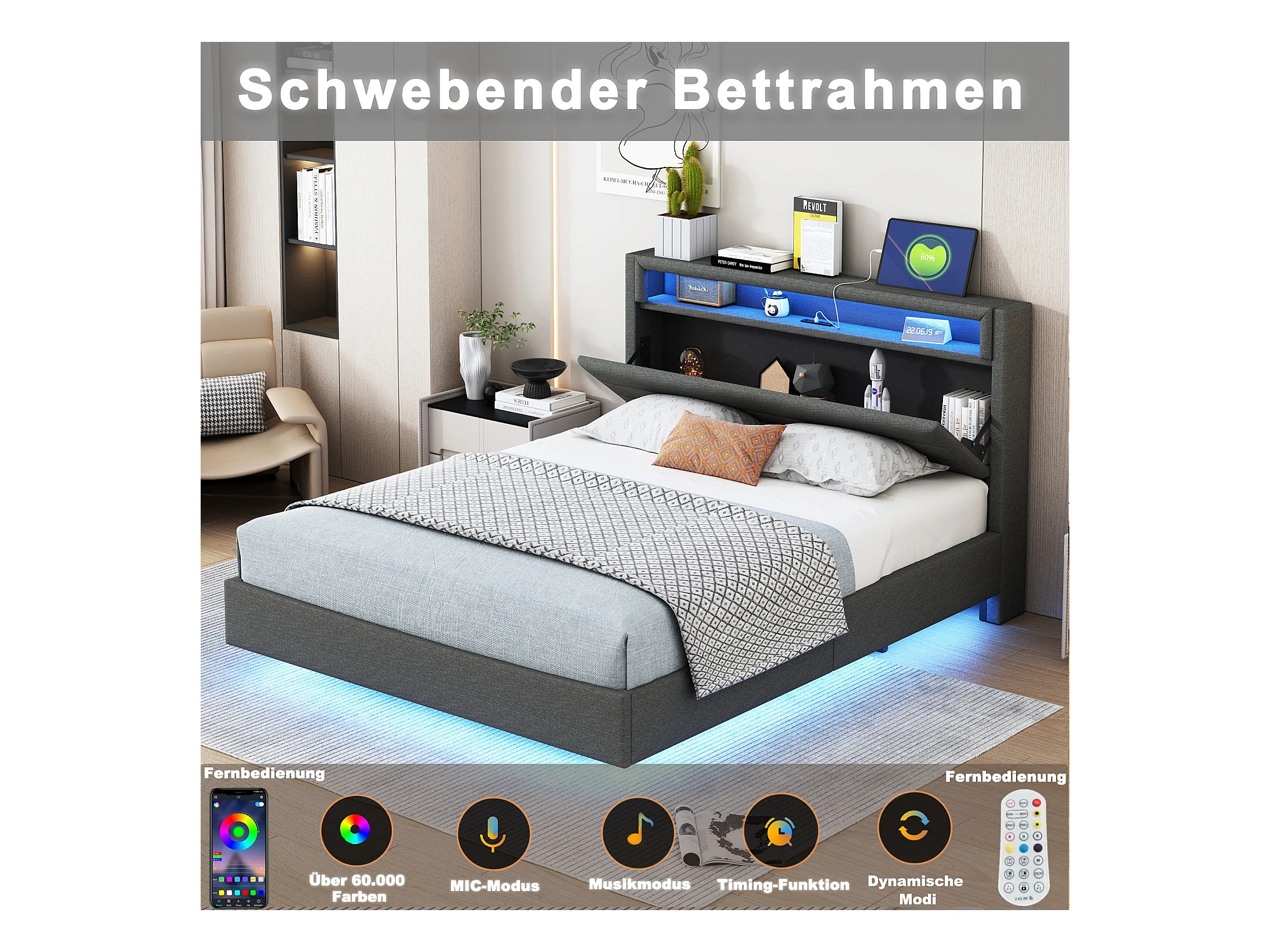 Lit avec rangement hydraulique 140x200 cm, sans tête de lit, avec LED intégrée, cadre flottant, gris (214.5x155x29.5 cm)