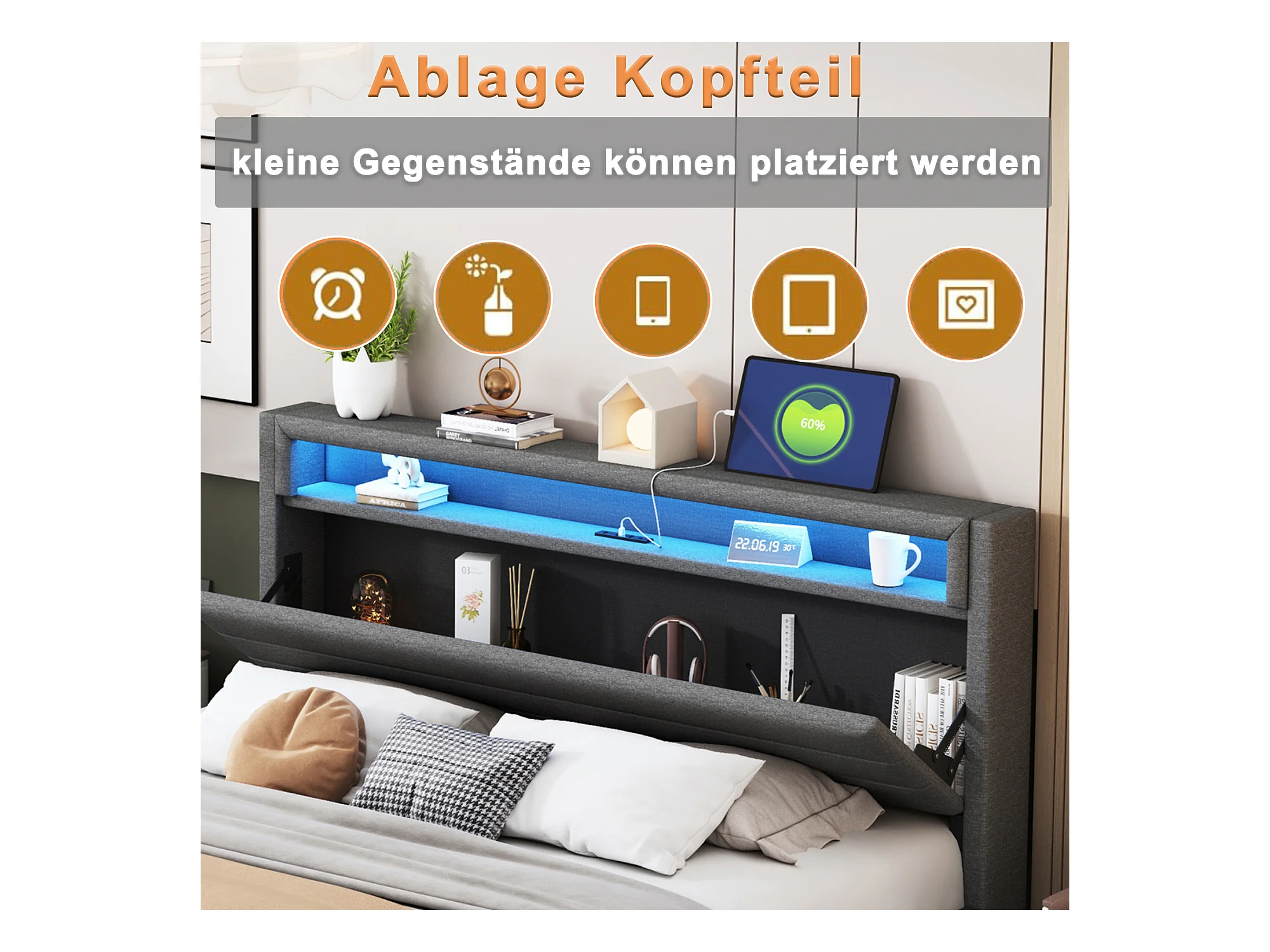 Lit LED 140 x 200 cm avec rangement hydraulique, port USB, tissu lin gris (213 x 146 x 113 cm)