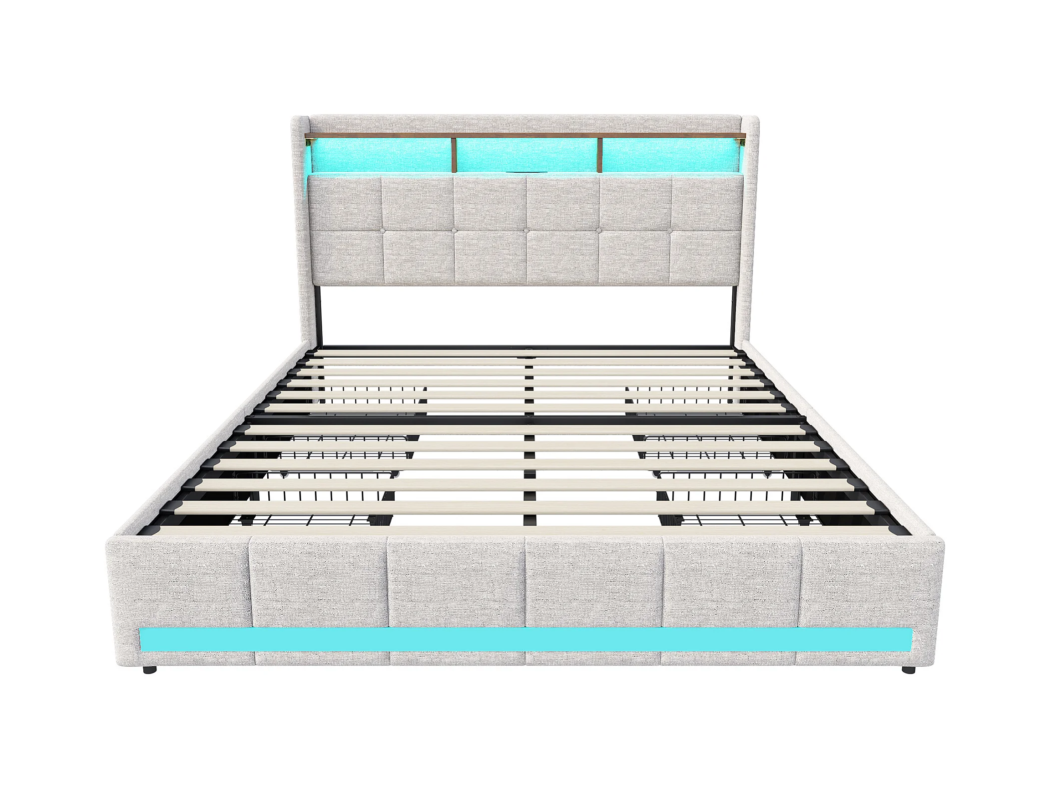 Lit 140x200 Sommier LED Et 2 USB, Type-c, Lit Capitonné Lit Double Avec 4 Tiroirs, Lin, Beige