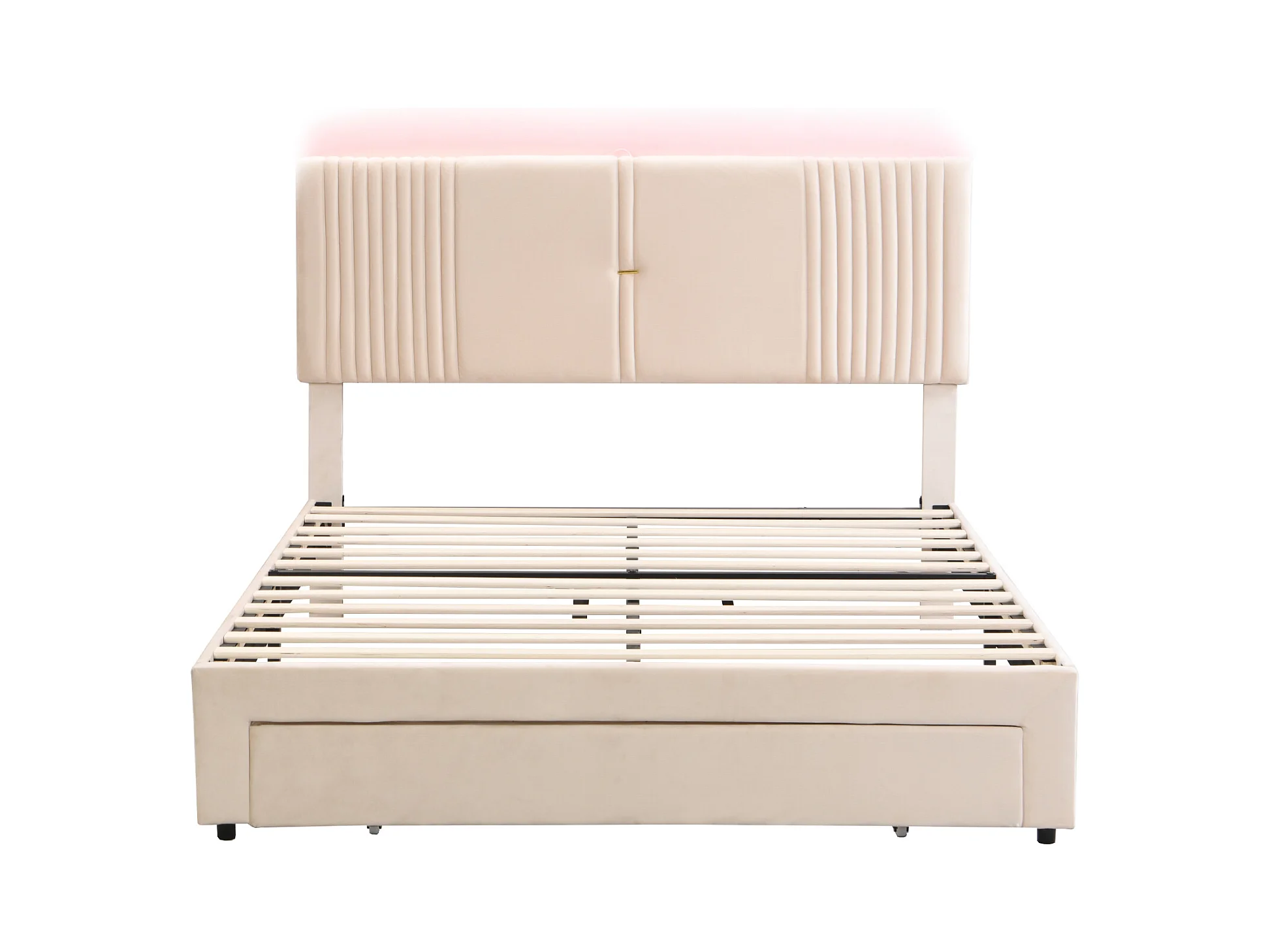 Lit 140x200cm beige, lit adulte double tiroirs de rangement,bande lumineuse + USB, velours, sans matelas