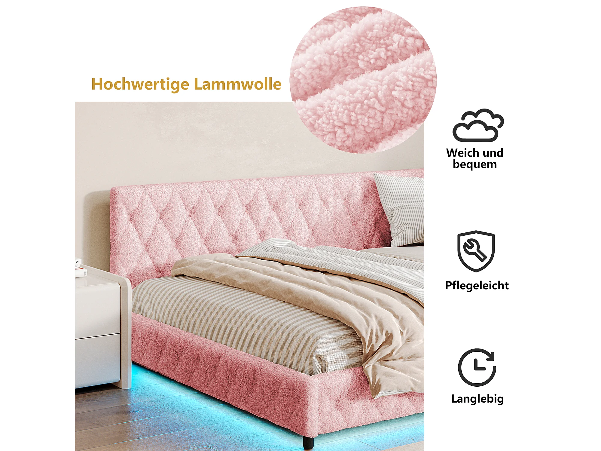 Lit 140x200cm, Lit Double Avec LED, Port USB, Type-c, Tissu En Peluche, Canapé-lit, Rose