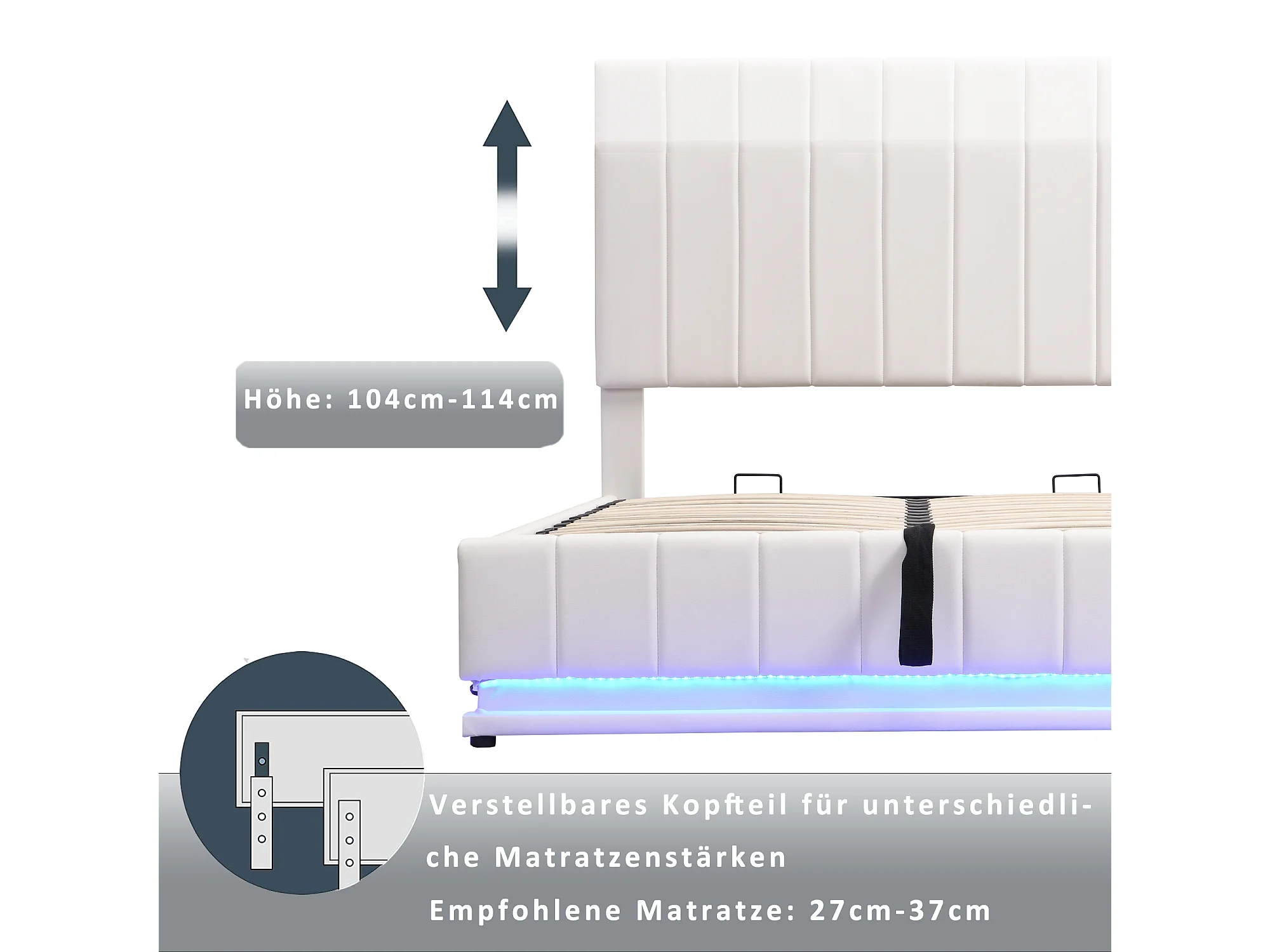 Lit 160 x 200 cm avec LED, Tête de Lit Réglable, Cadre Stable, Stockage Hydraulique, Cuir Synthétique, Blanc (202.5 x 162 x 101 cm)