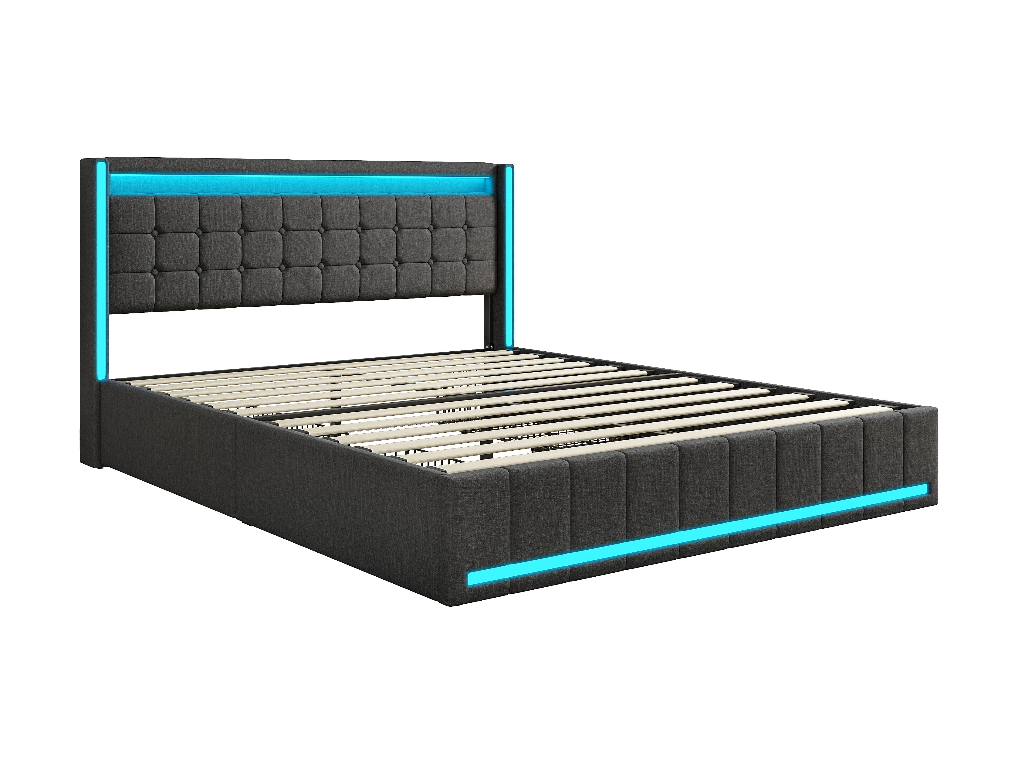 Lit double 160*200 cm, port de chargement USB de chevet, lumière LED, avec 4 tiroirs en fer, gris foncé, lin