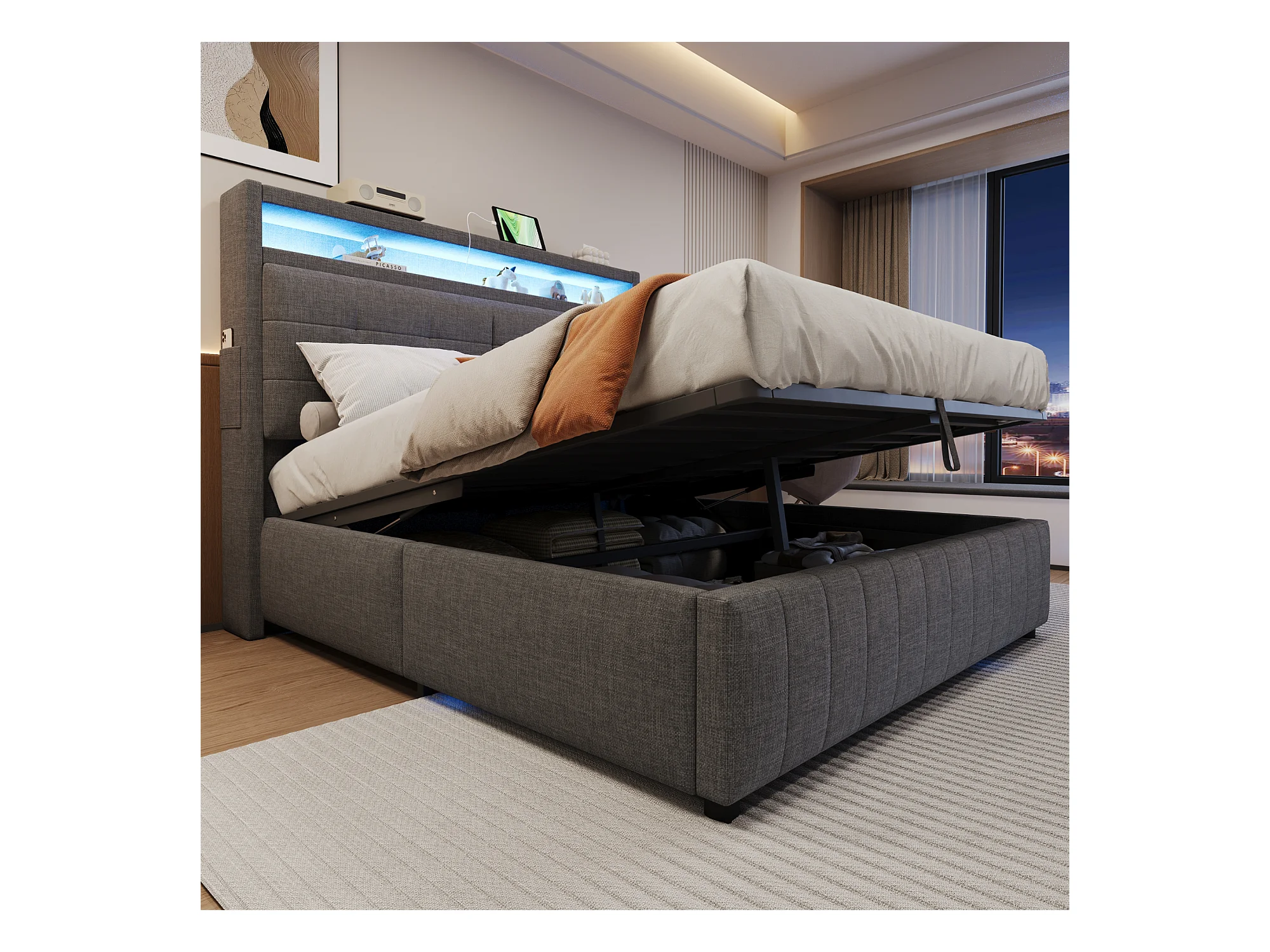Lit 160x200 cm avec LED, USB, tête de lit avec étagères et rangement, hydraulique, cadre métal, tissu lin gris (213x167x110.5 cm)