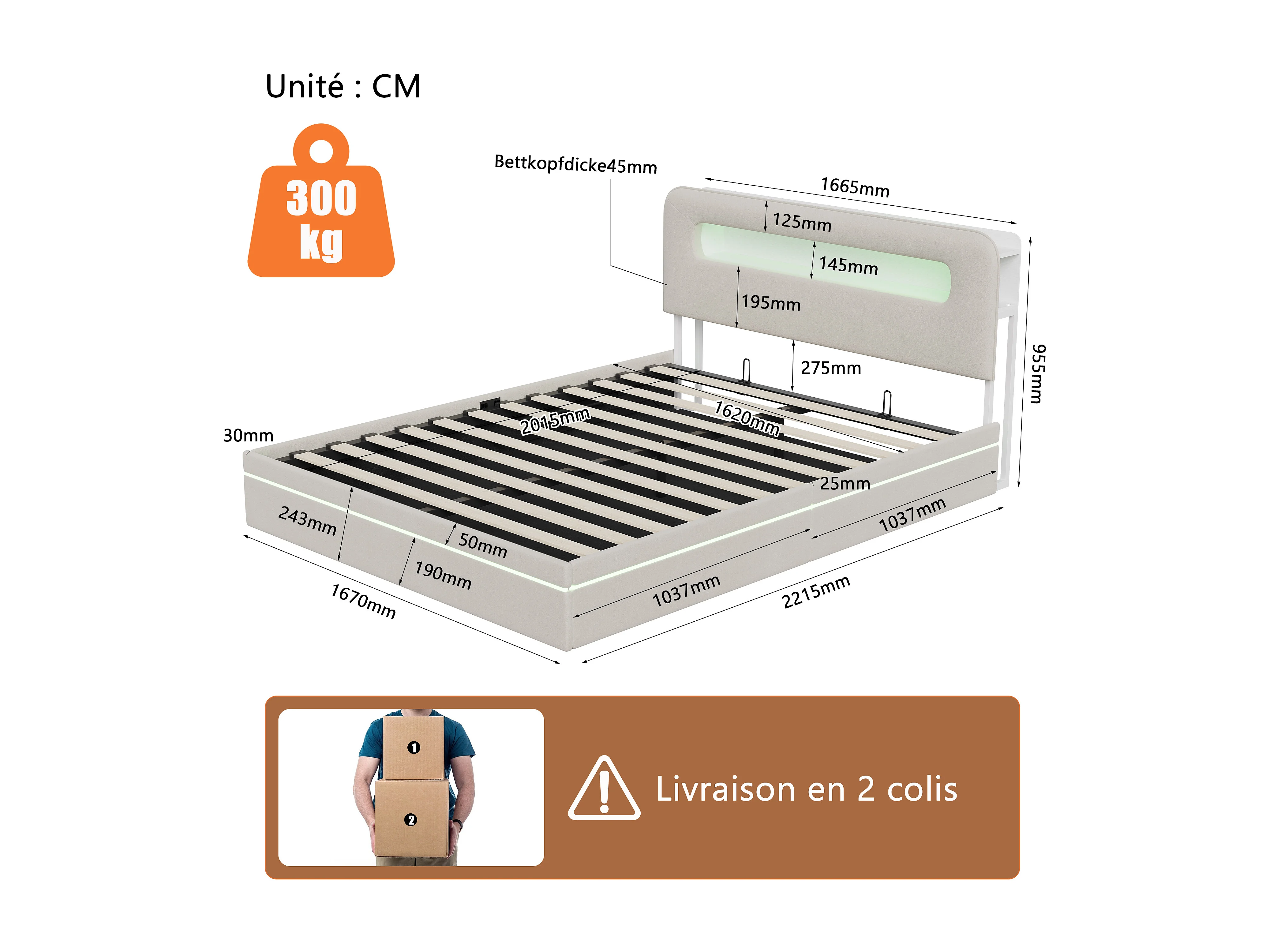 Lit 160x200 cm en velours beige avec LED intégrées, tête de lit avec rangement et système hydraulique