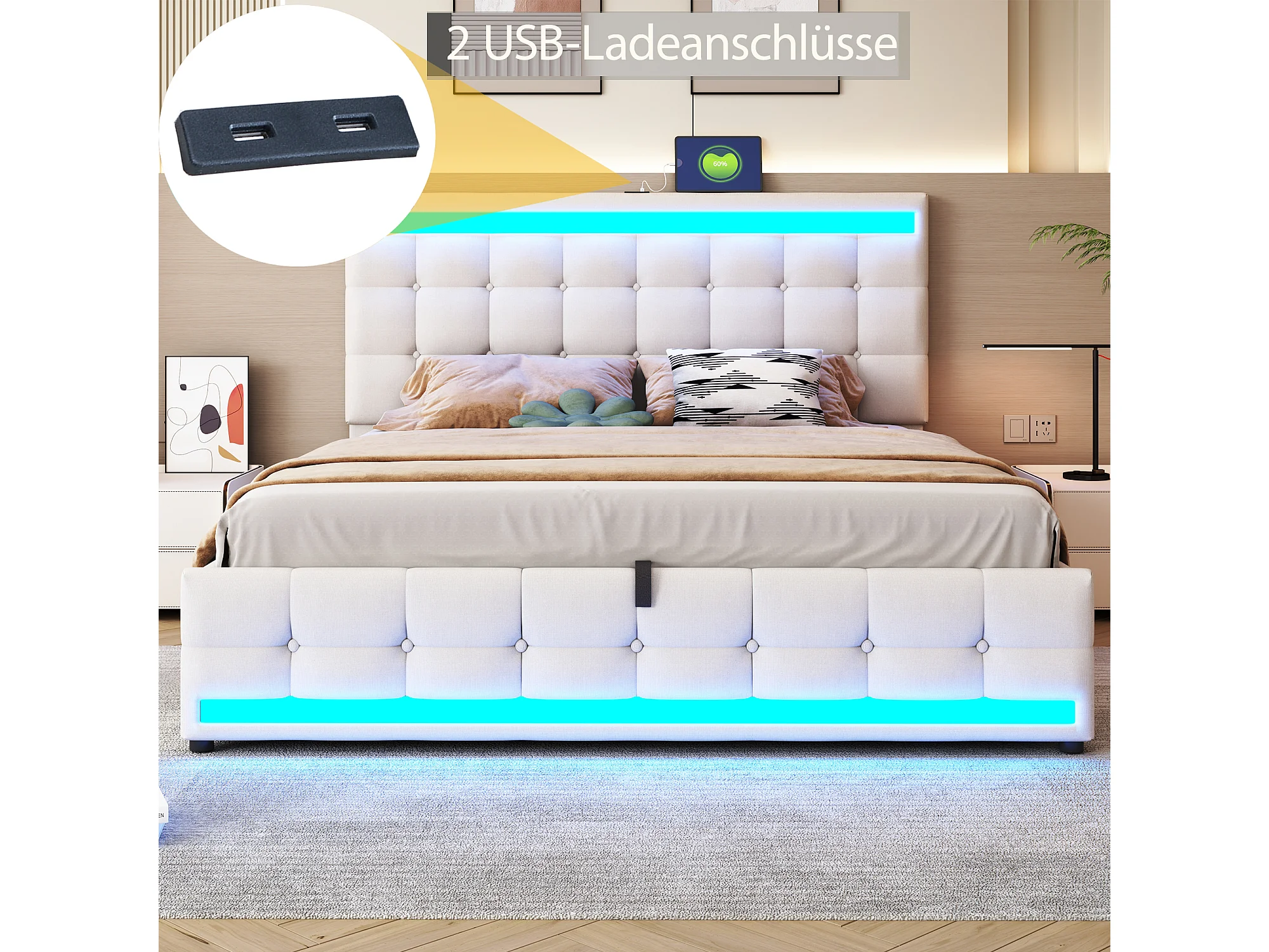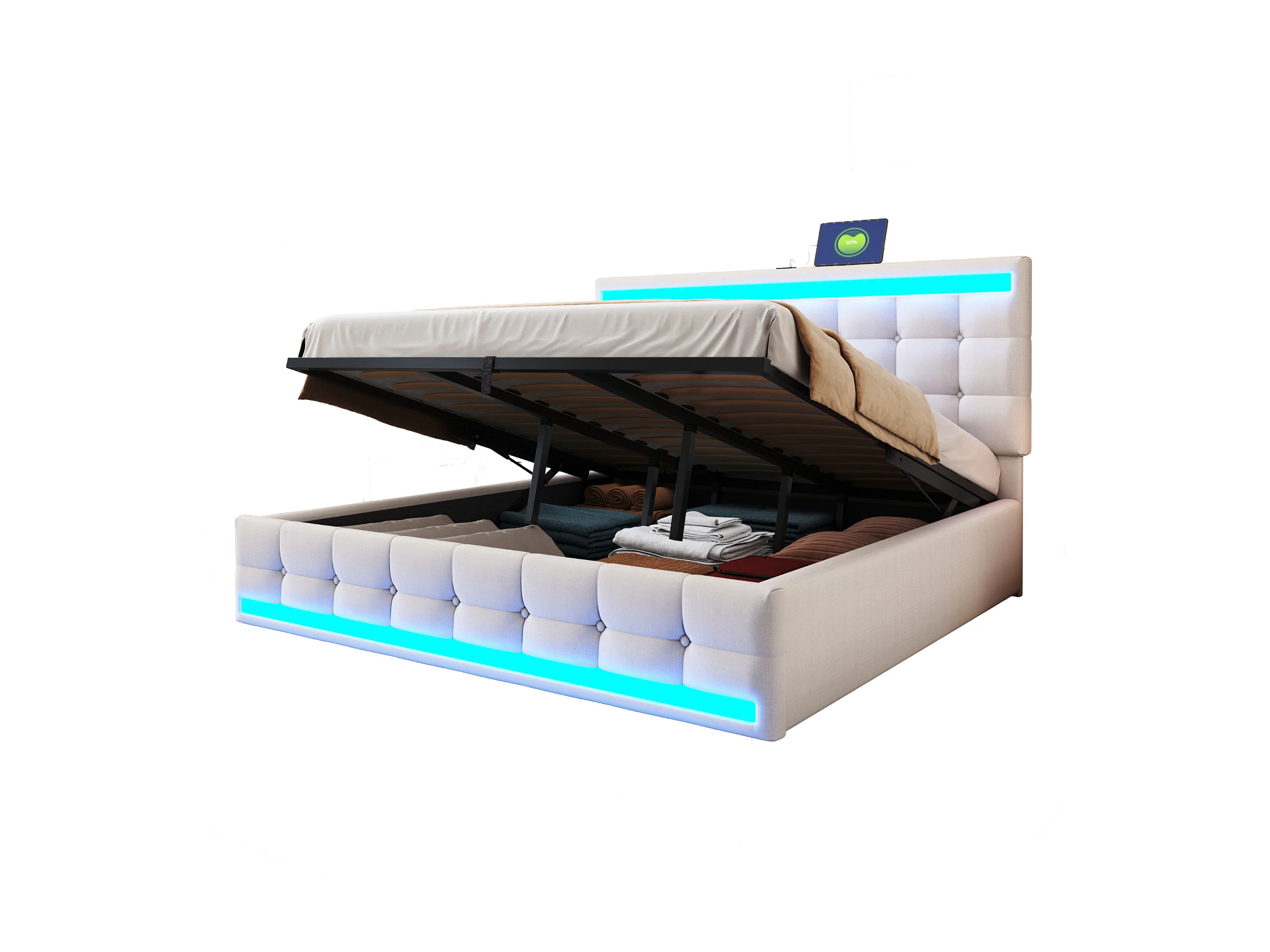 Lit 180x200 cm avec rangement, USB, et LED RGB, hydraulique, cadre en bois, beige (208x186x112 cm)