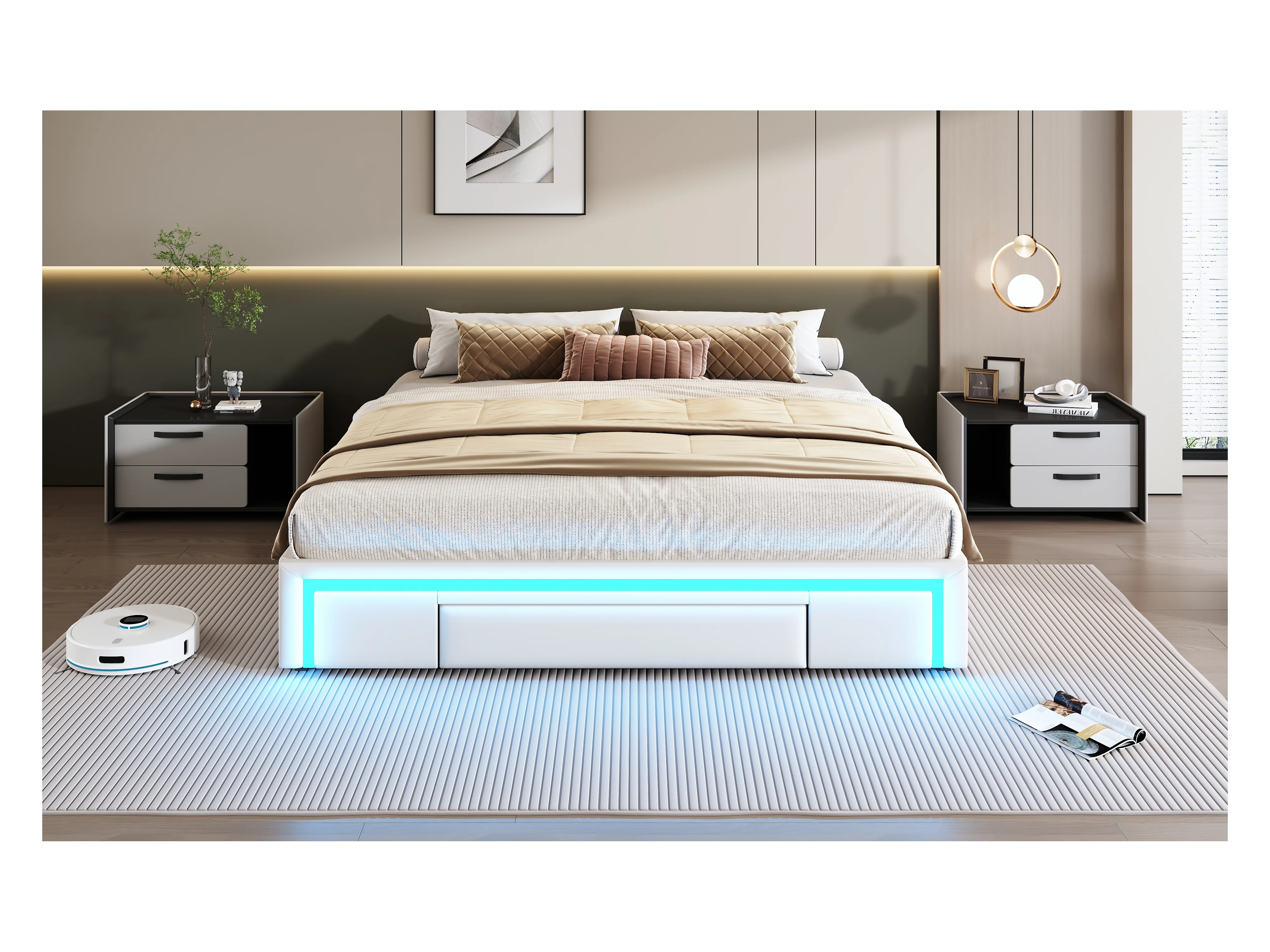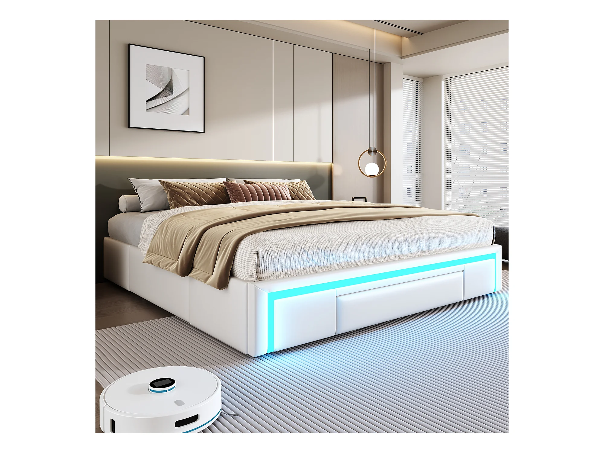 Lit 180x200 cm avec tiroirs, lit en PU simili-cuir sans tête de lit, avec éclairage LED, en métal (200x180x32 cm)