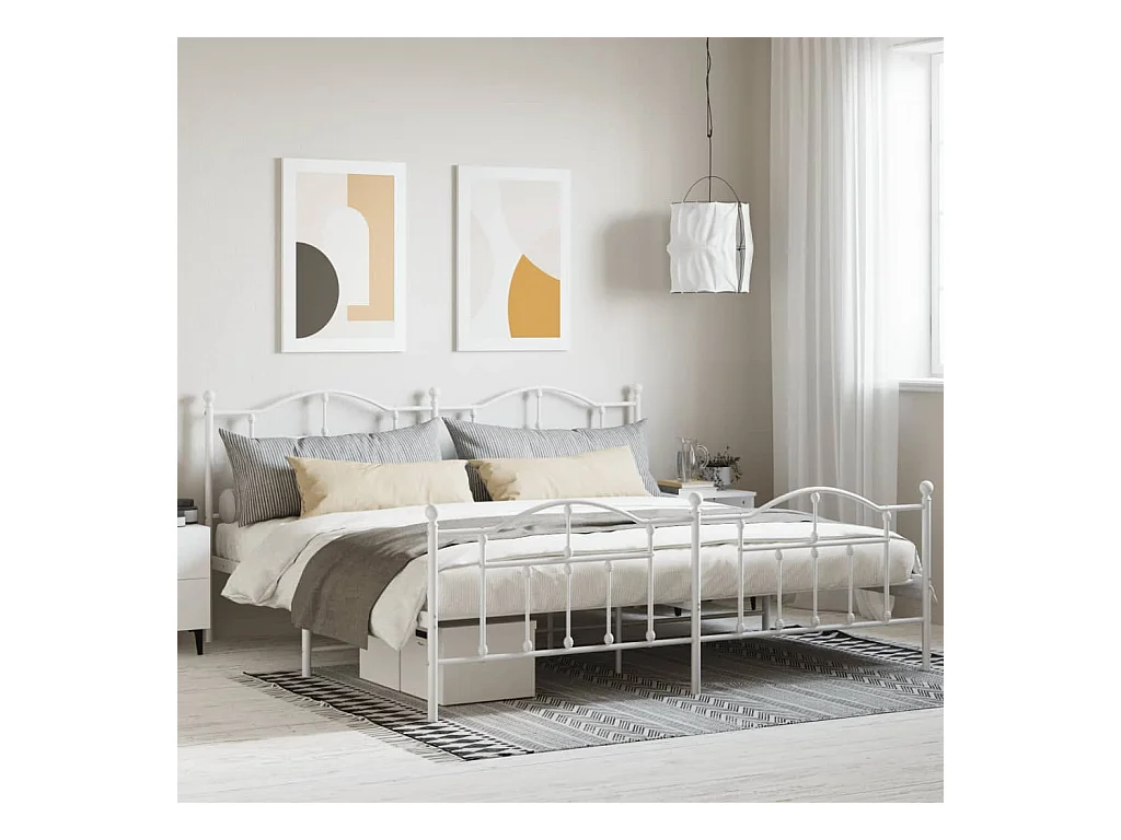 Lit double métal + tête de lit/pied de lit blanc 200x200cm FR35671