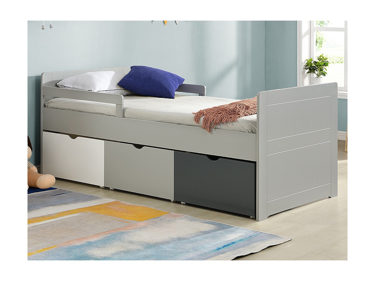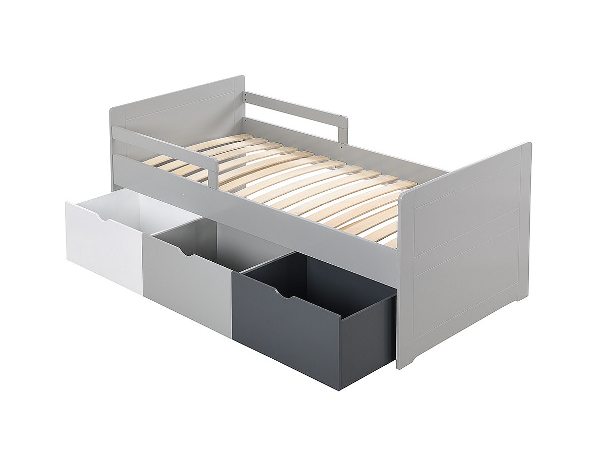Lit 3 tiroirs PILOU - 90 x 190 cm - MDF gris, blanc, noir