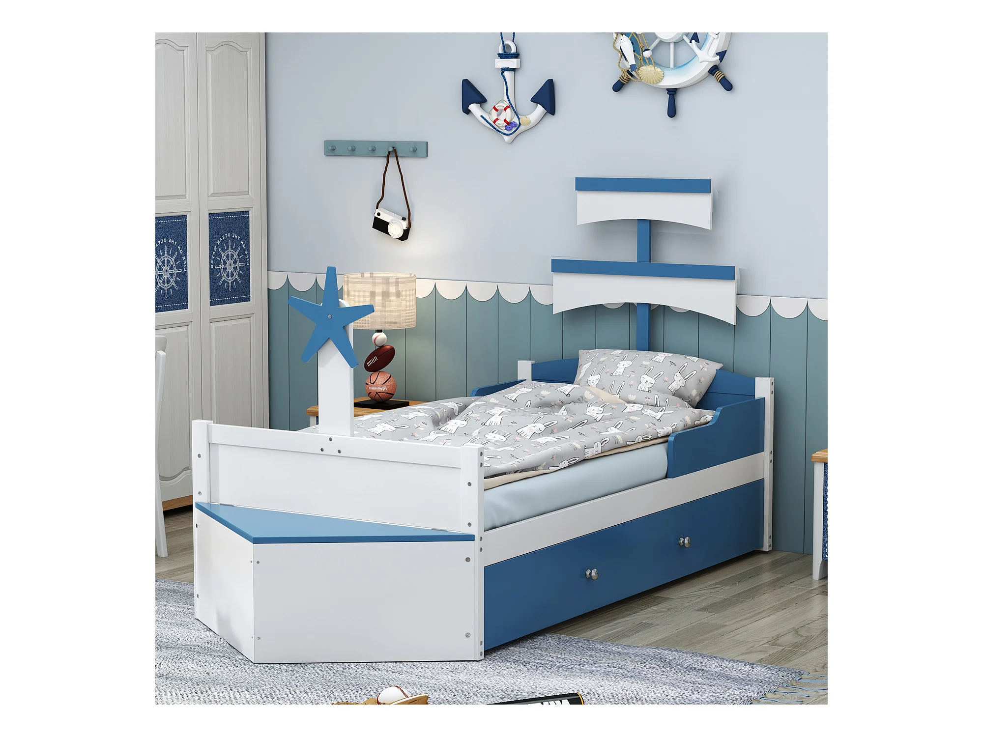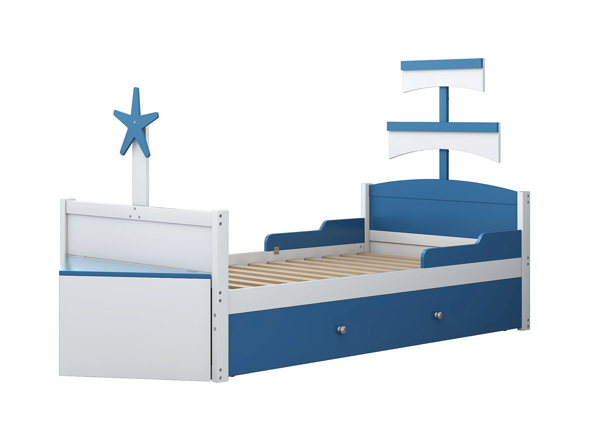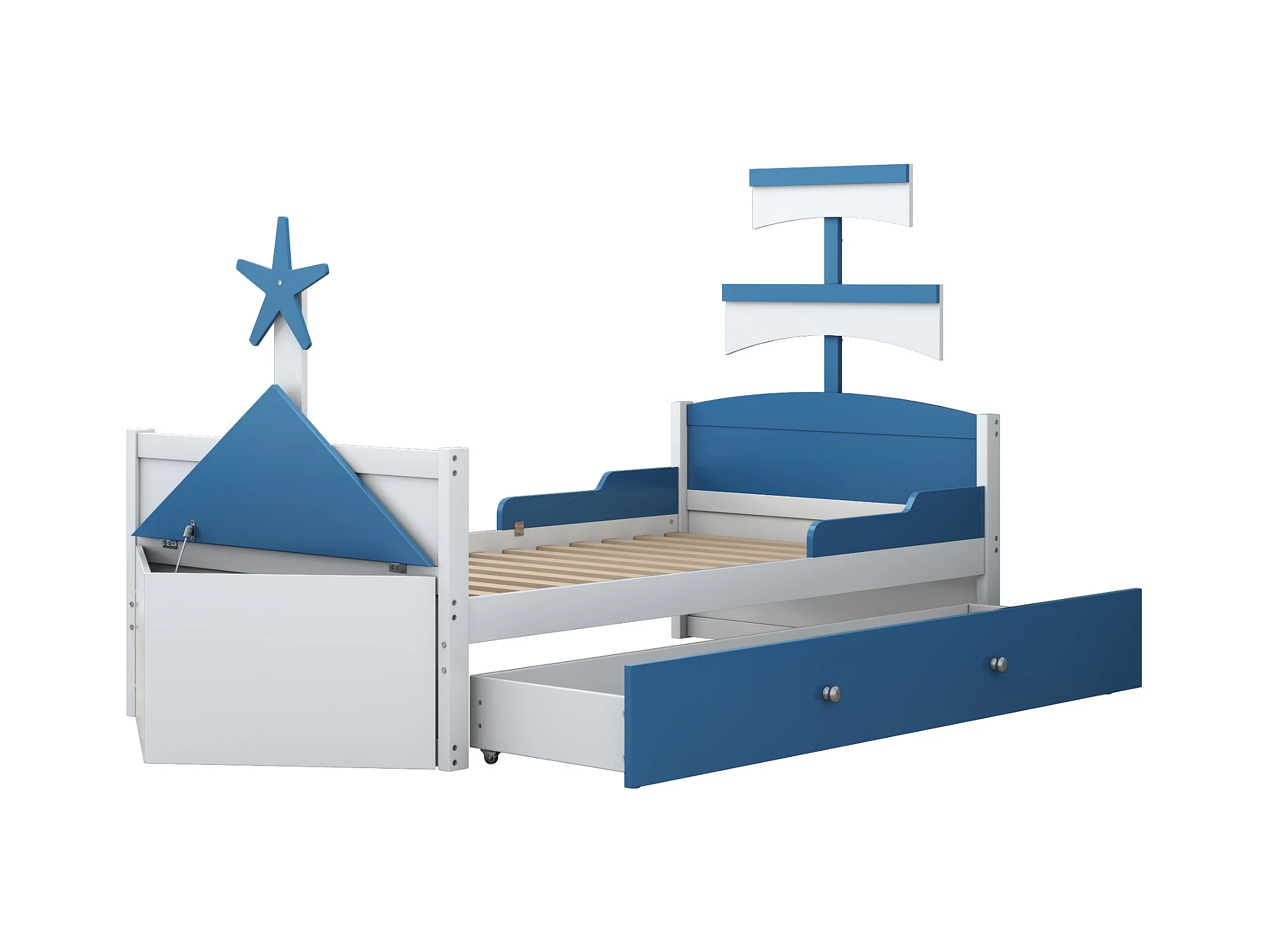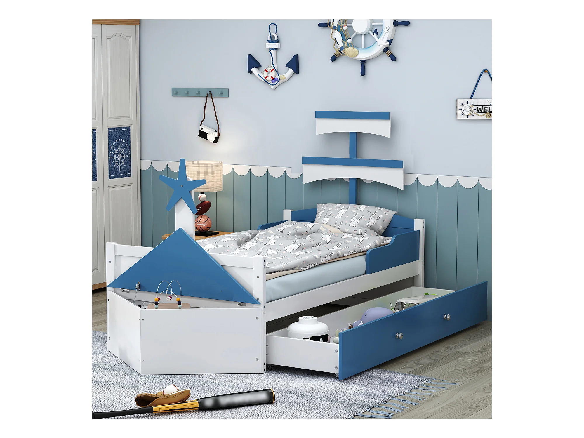 Lit 90 x 200 cm avec un grand tiroir et placard de rangement - bois MDF - sommier à lattes - bleu et blanc