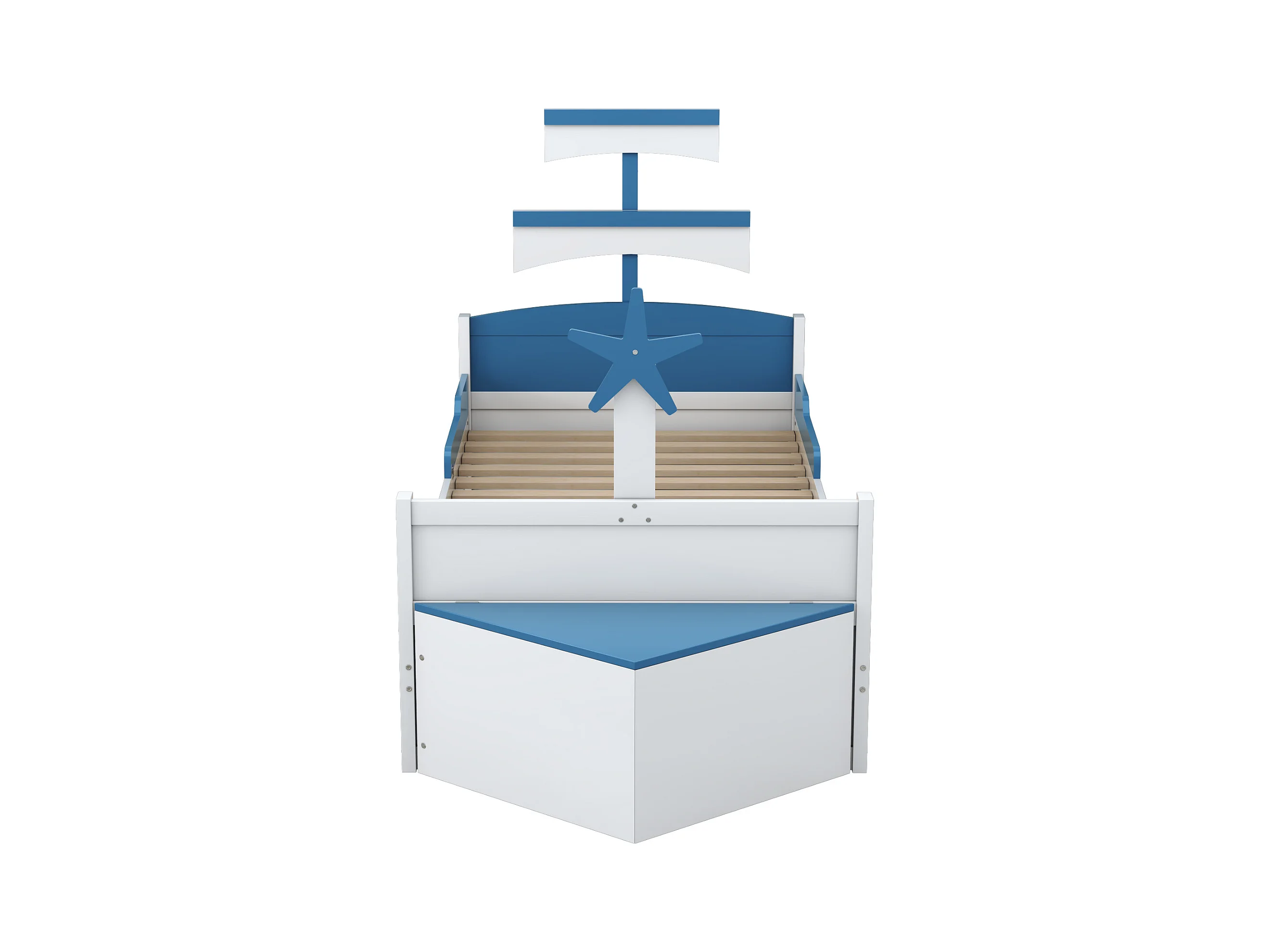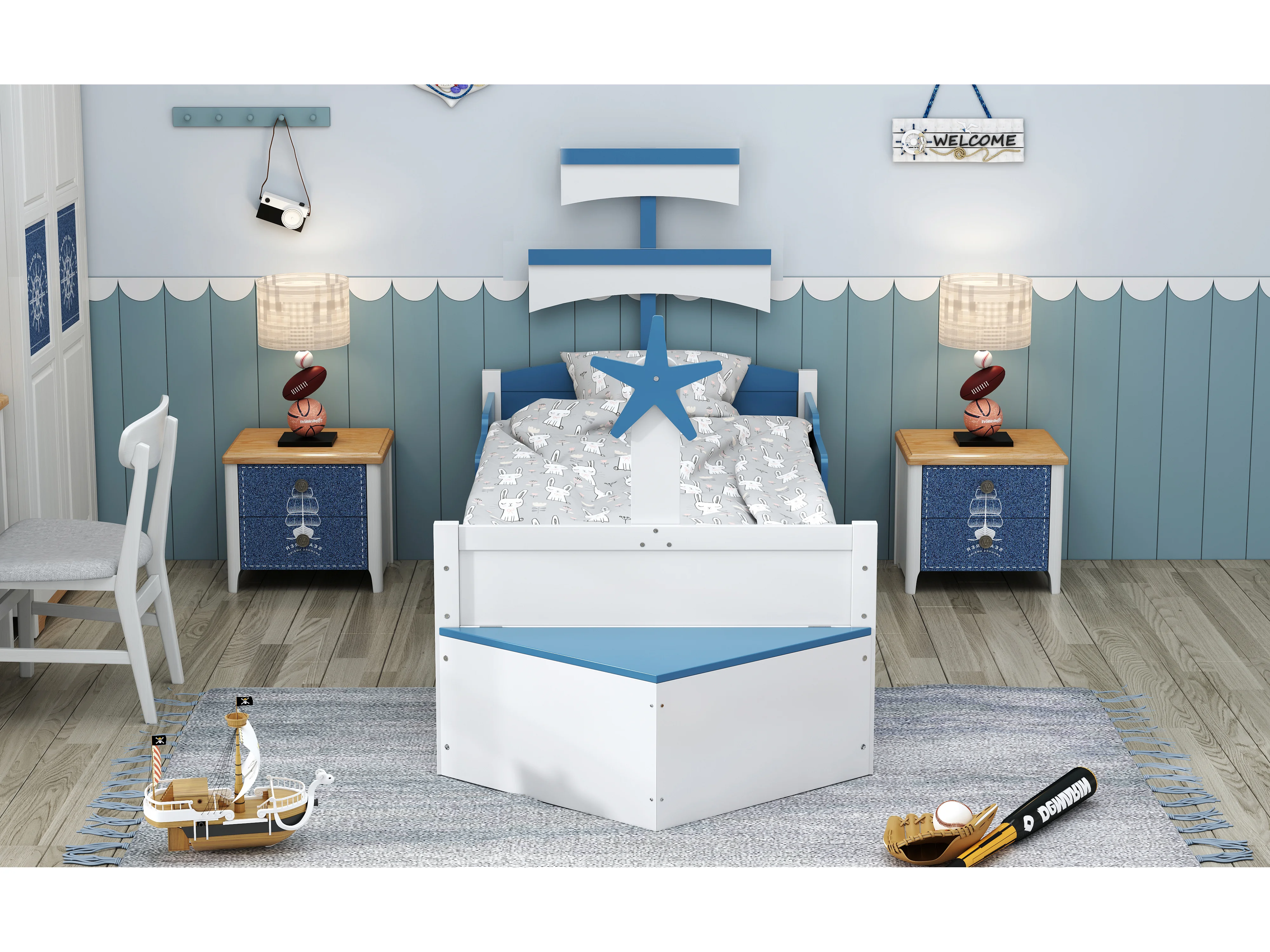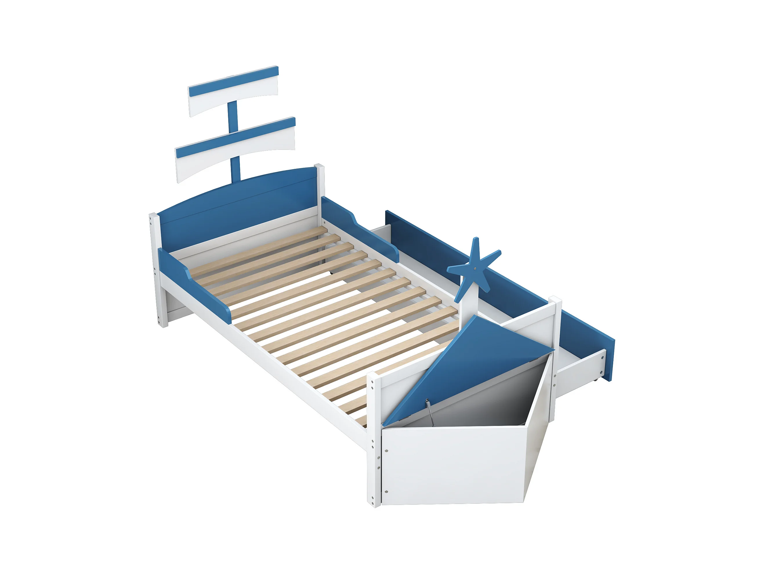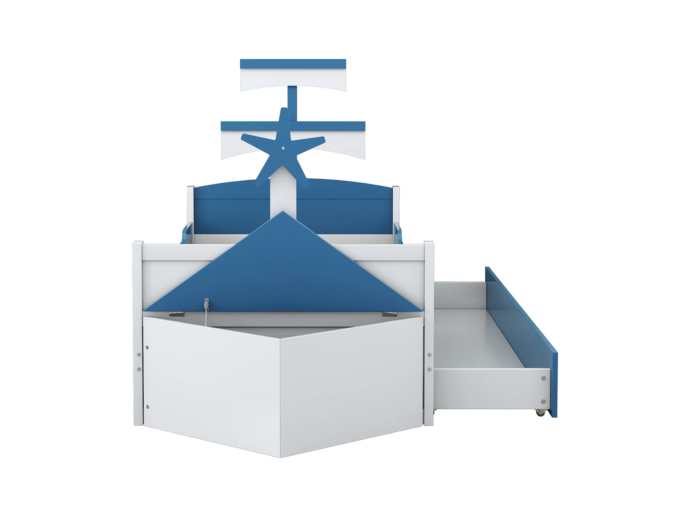 Lit 90 x 200 cm avec un grand tiroir et placard de rangement - bois MDF - sommier à lattes - bleu et blanc