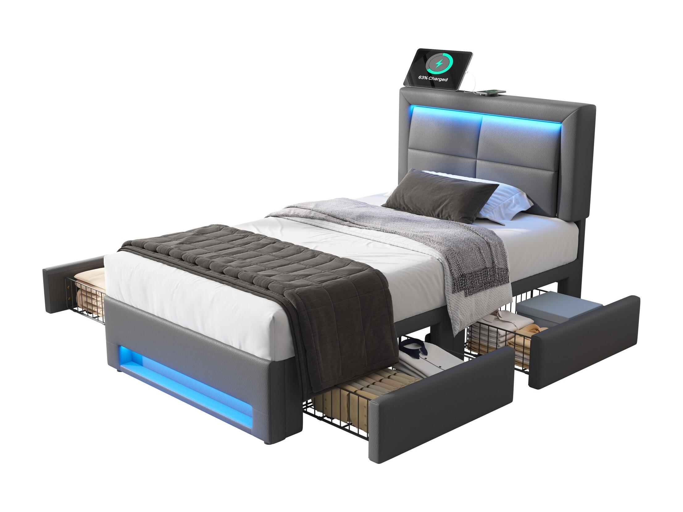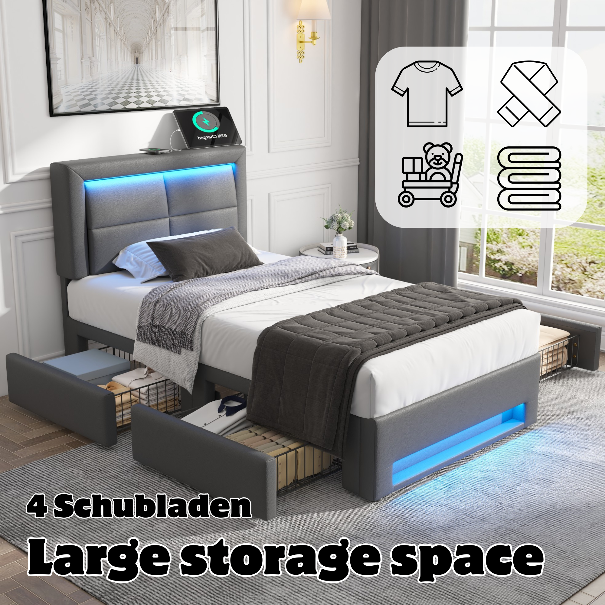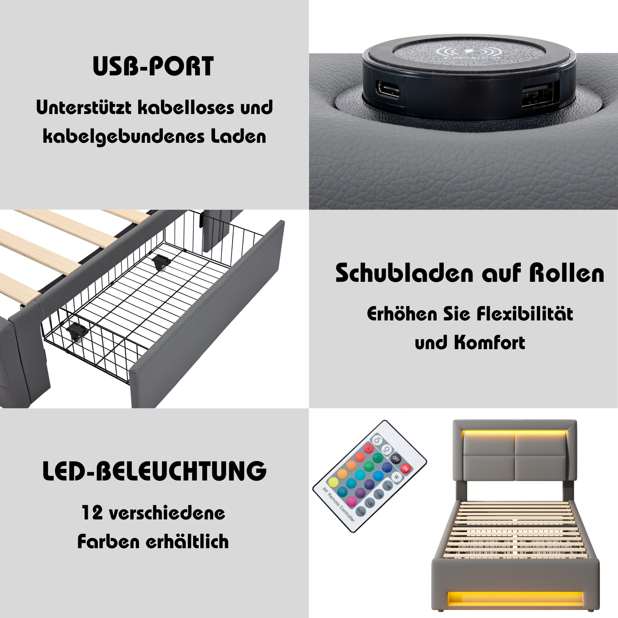 Lit 90x190 cm avec USB, LED et tiroirs, en PU gris (90x190x95 cm)