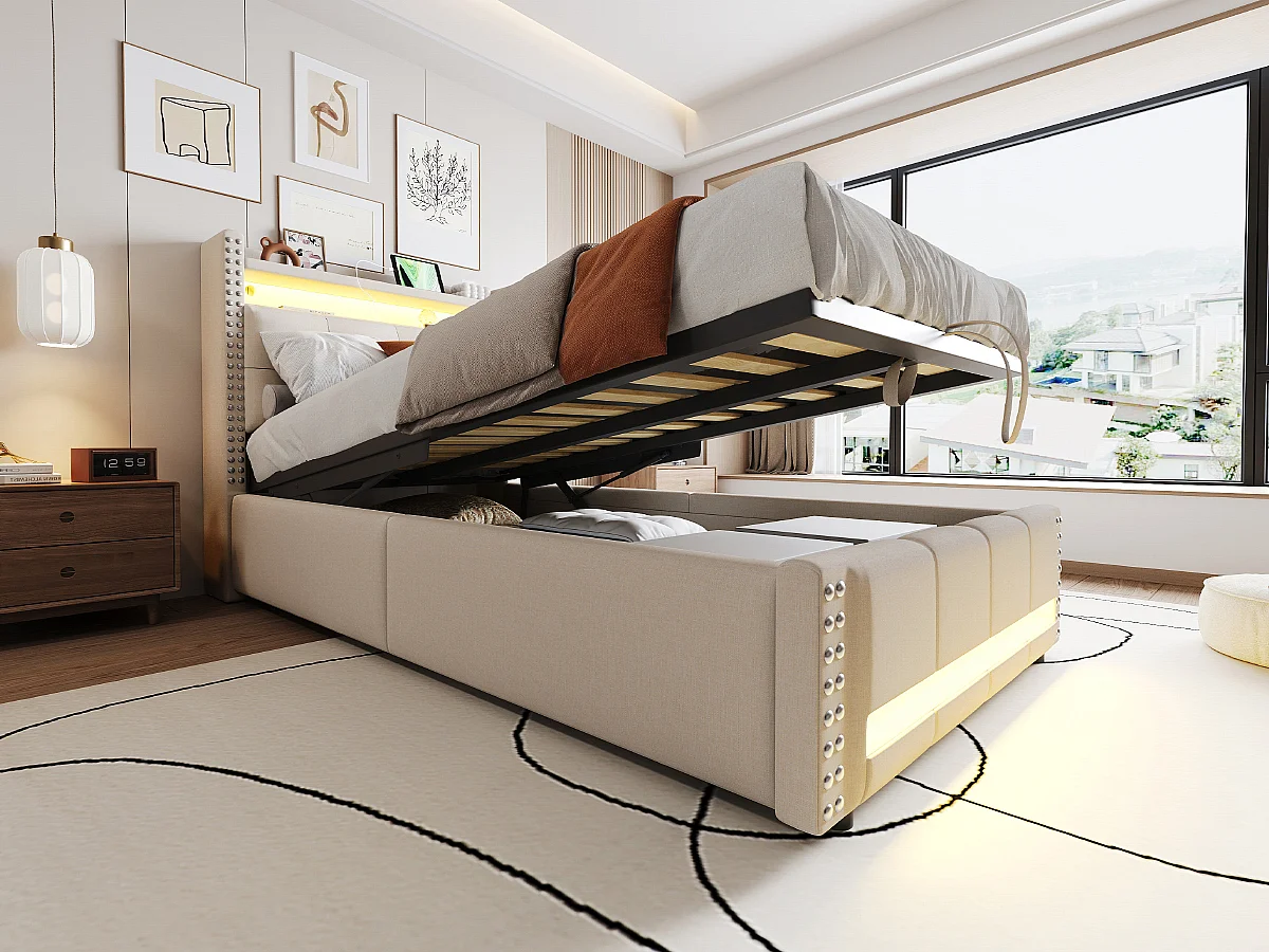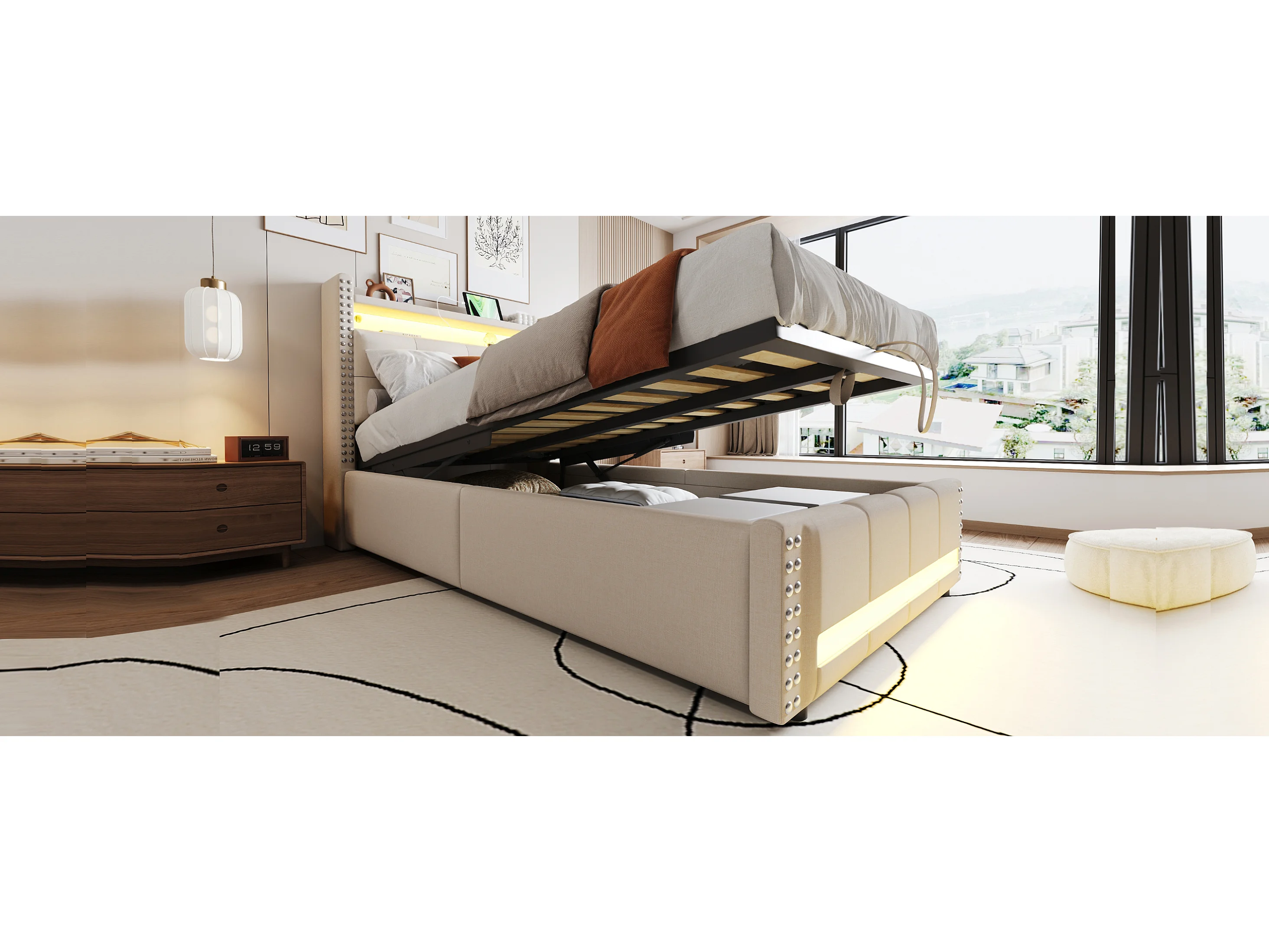 Lit 90x200 cm avec rangement hydraulique, USB et LED, tête de lit avec étagères et espace de stockage, tissu lin beige (224x100x115 cm)