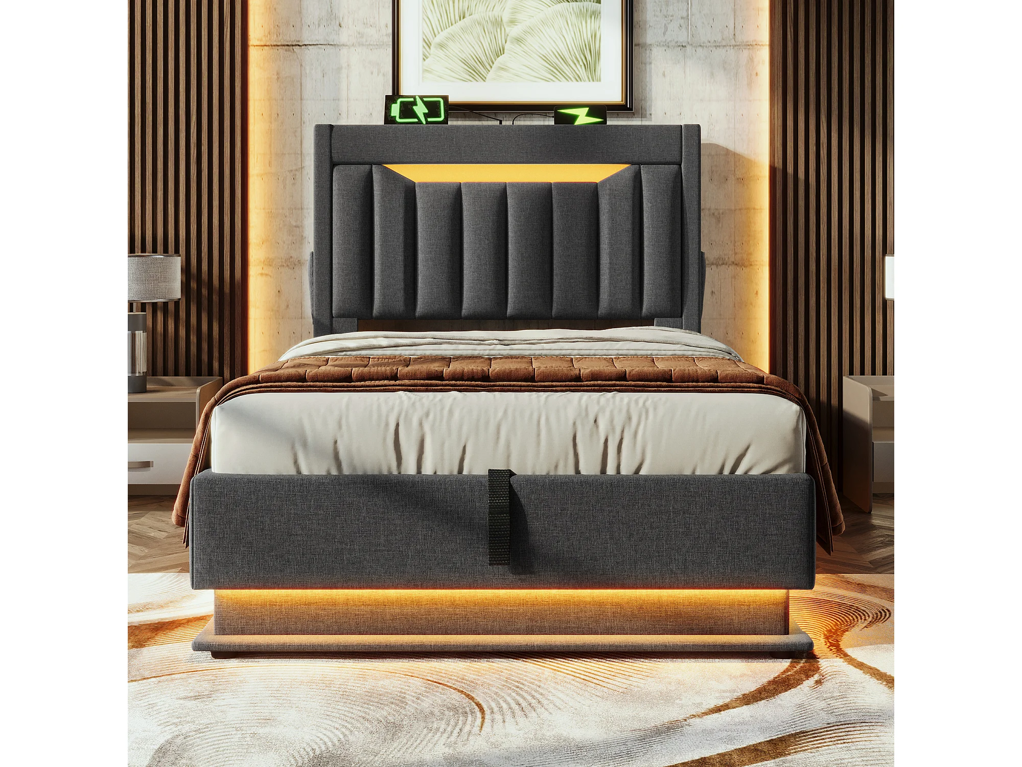 Lit 90x200 cm avec tête de lit de rangement, ports USB et Type-C, éclairage LED, stockage hydraulique, lin gris, avec matelas (218x92x112 cm)