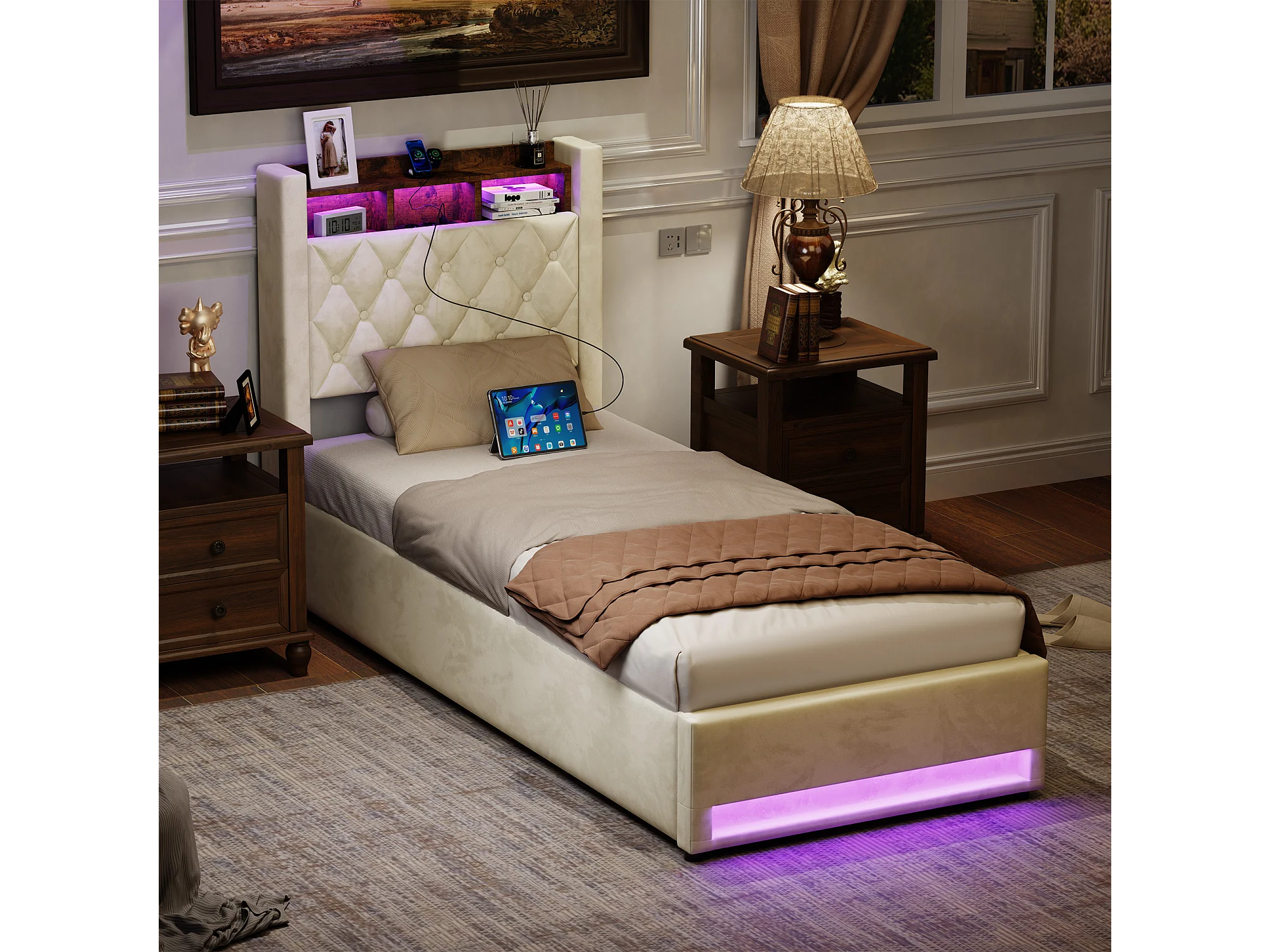 Lit 90x200 cm, capitonné, équipé de LED, ports USB et Type-C, vaste espace de stockage, beige