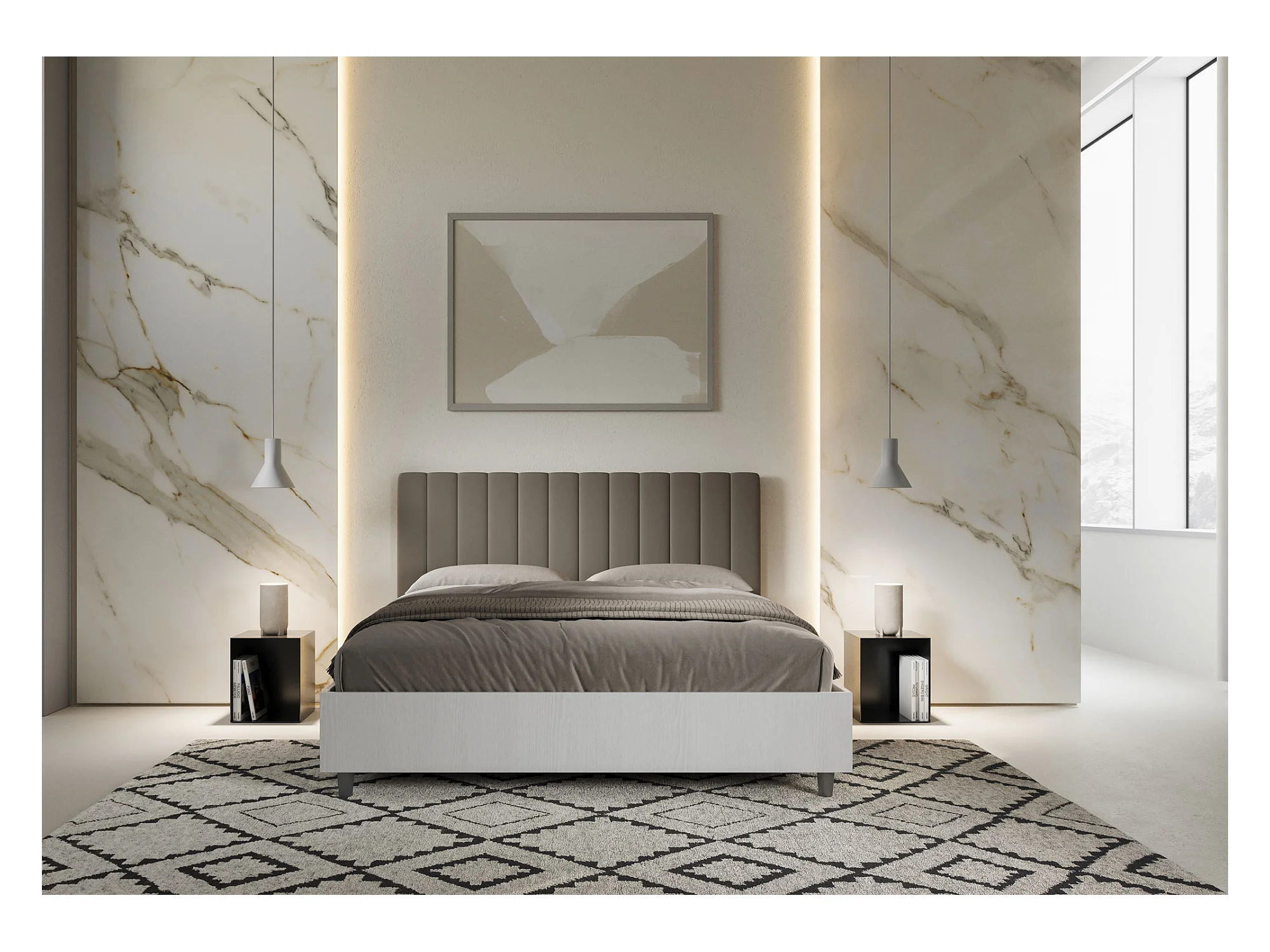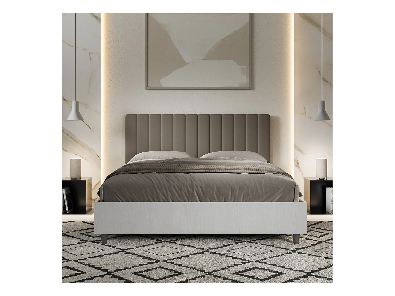 Lit avec sommier 160x190 structure frêne blanc tête de lit similicuir cappuccino Kaia