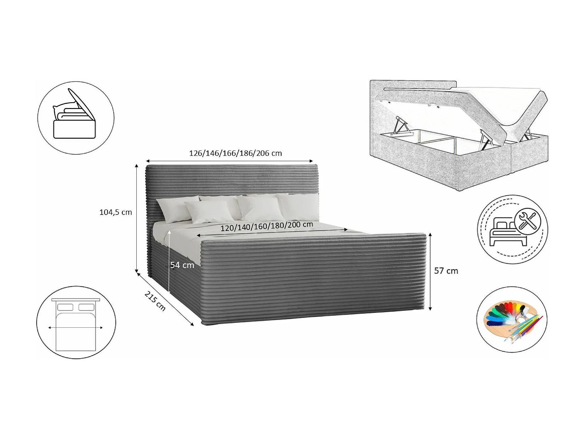 Lit boxspring avec sommier et surmatelas VIESTA tissu Poso gris foncé 160x200 cm H3-Bonell