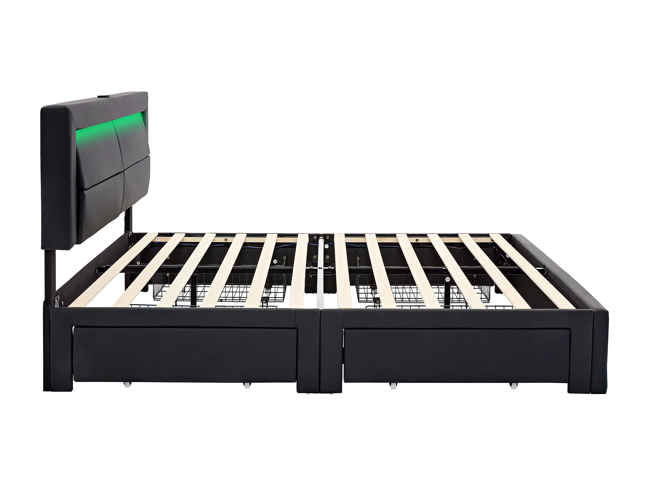 Lit adulte 140 x 190 cm avec port USB et Tête de lit réglable, LED et rangement, PU noir, sans matelas