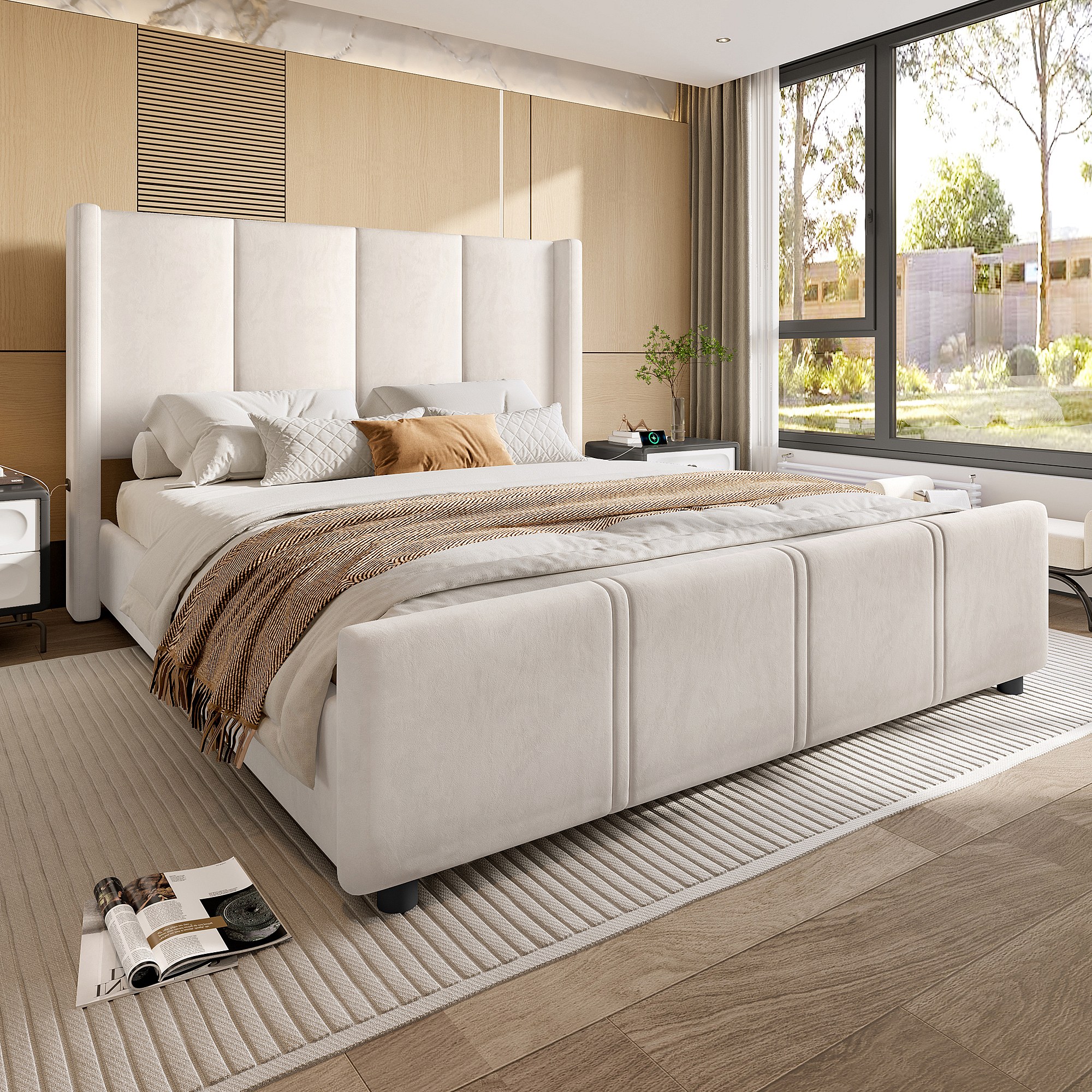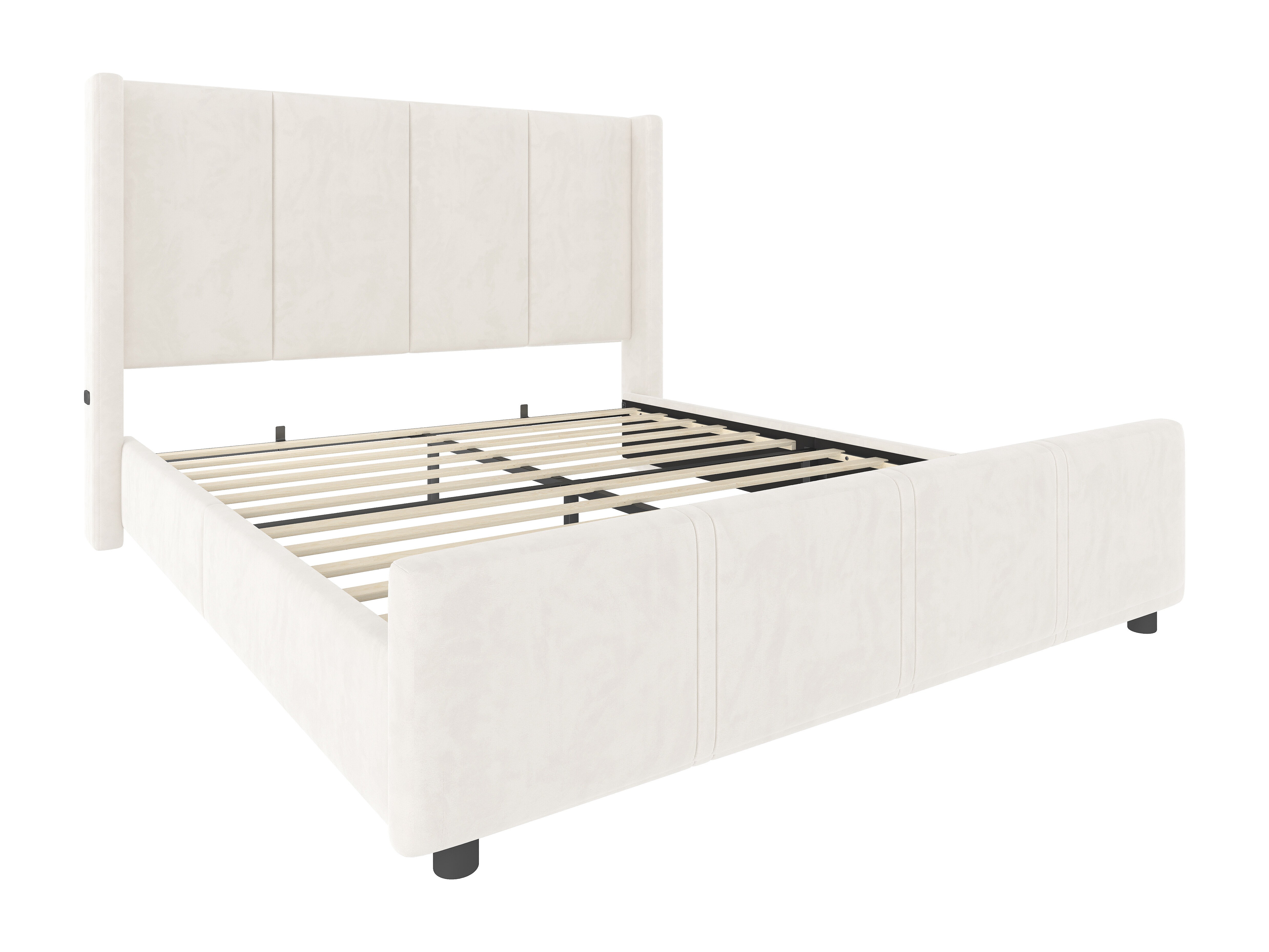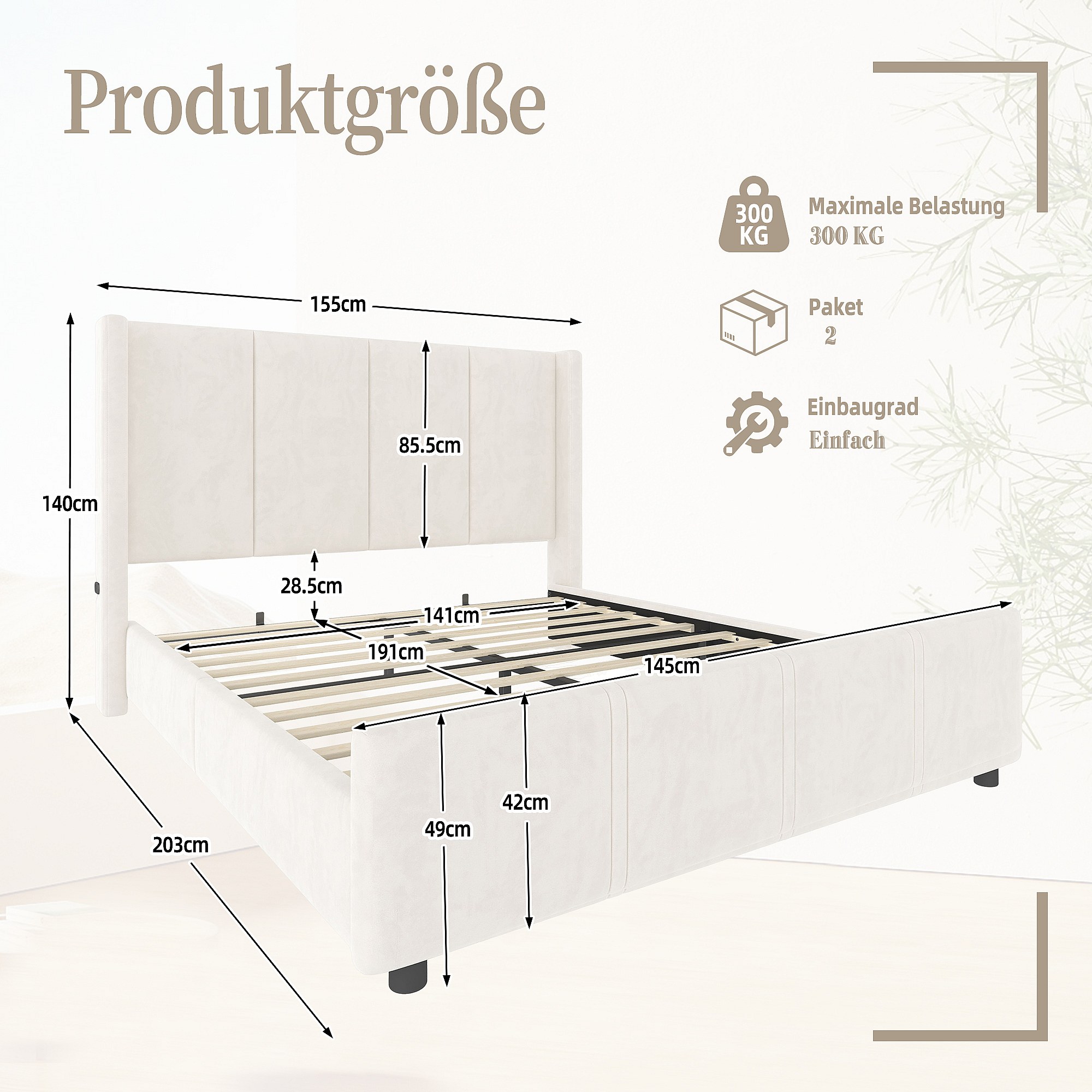 Lit adulte 140 x 190 cm - Lit double avec tête et pied de lit surélevés - velours beige - matelas non inclus