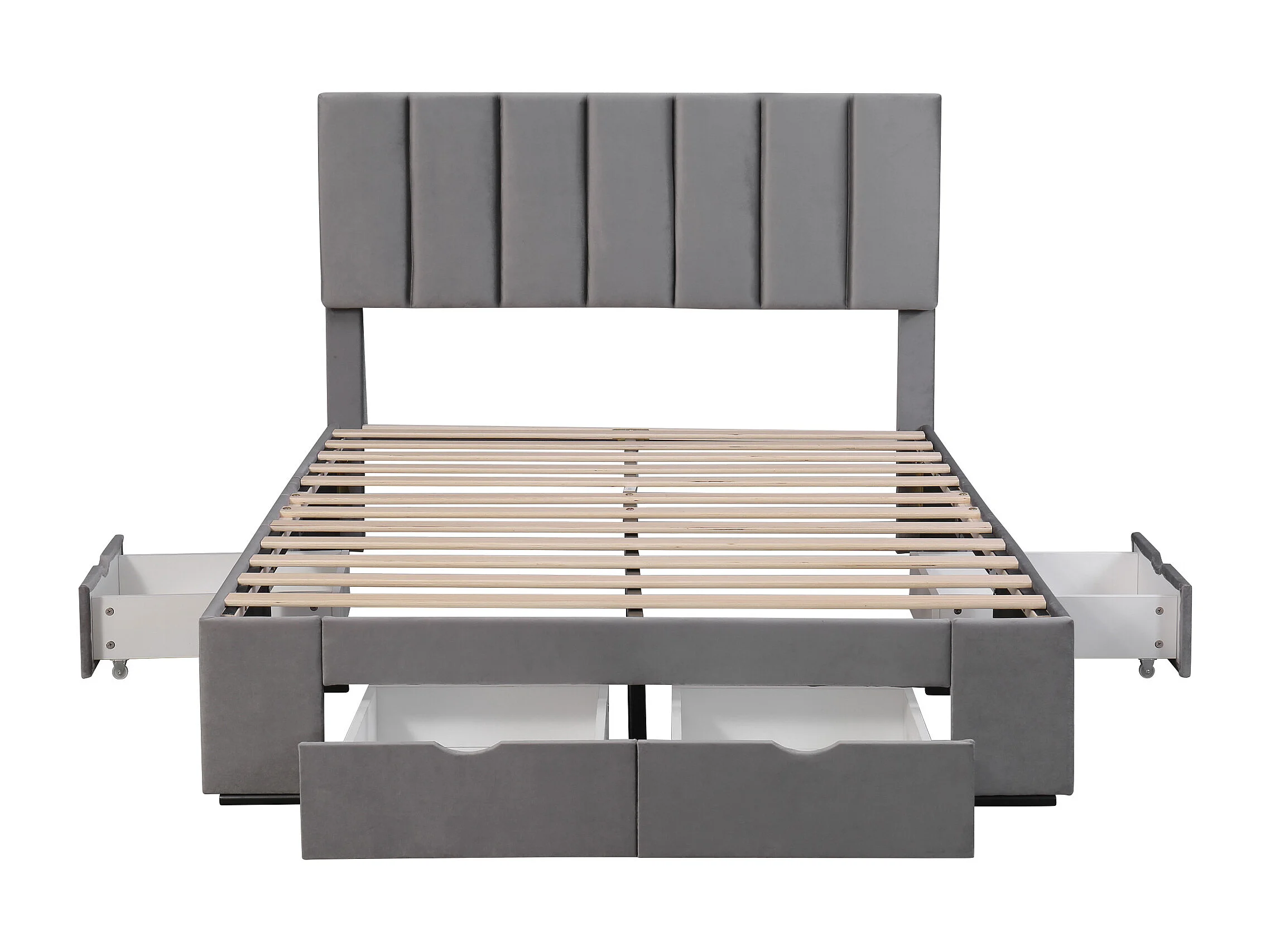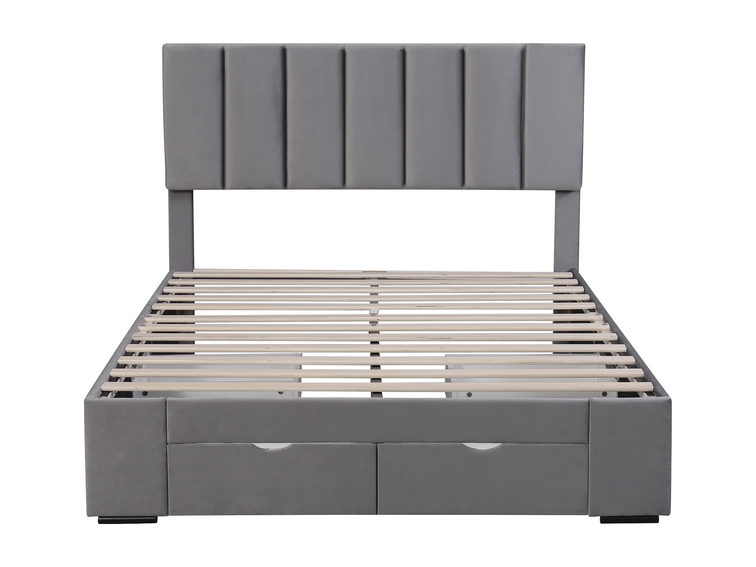 Lit adulte 140 x 200 cm - avec tête de lit, 4 tiroirs, sommier à lattes - en velours - gris - sans matelas