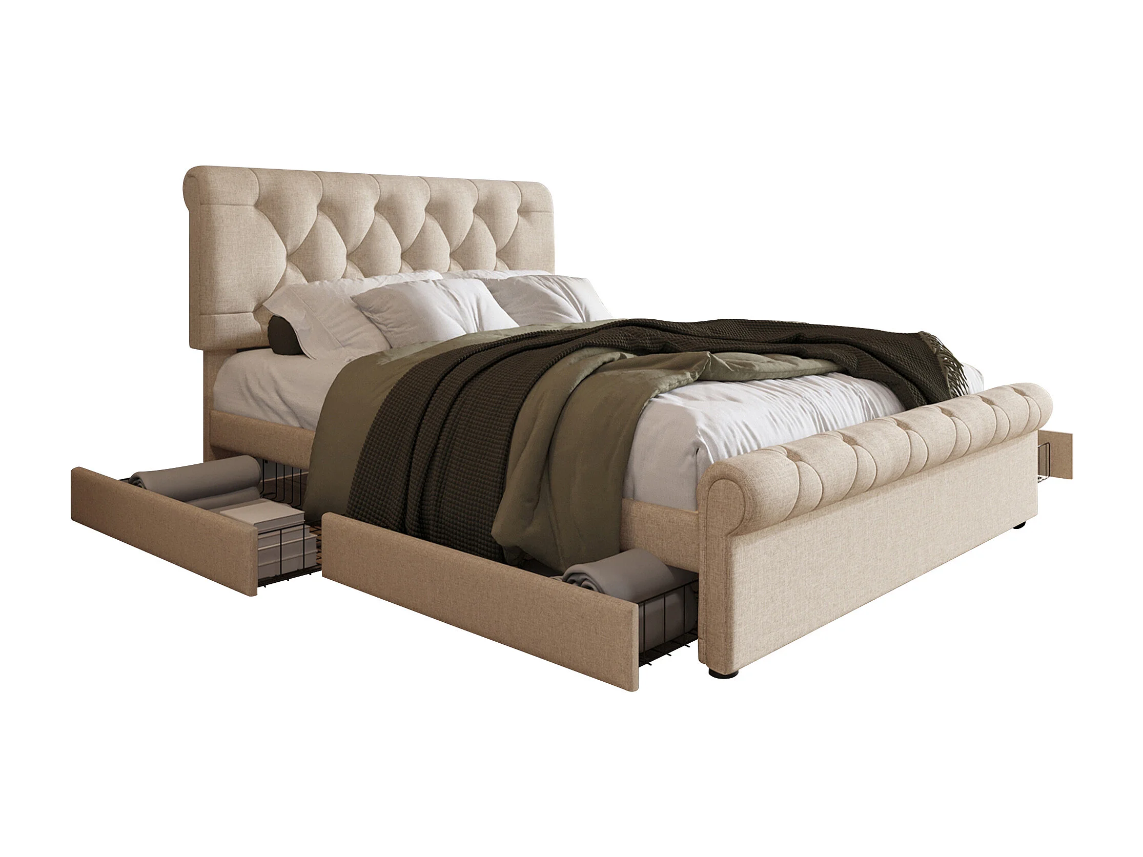 Lit adulte 140x200 cm - avec tête de lit réglable et 4 tiroirs - lin naturel - matelas inclus