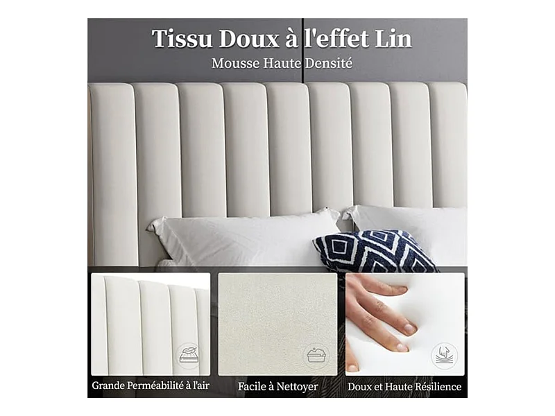 Lit rembourré 140*200 en design suspendu, tissu lin, avec lumières LED, ports USB et TYPE-C, beige