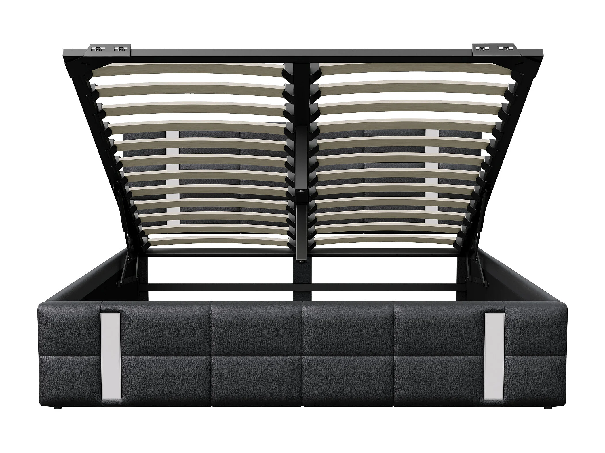 Lit adulte 160×200cm avec bande lumineuse LED, coffre de lit rangement, dossier, interface USB*2, lit capitonné, lit ado, PU noir