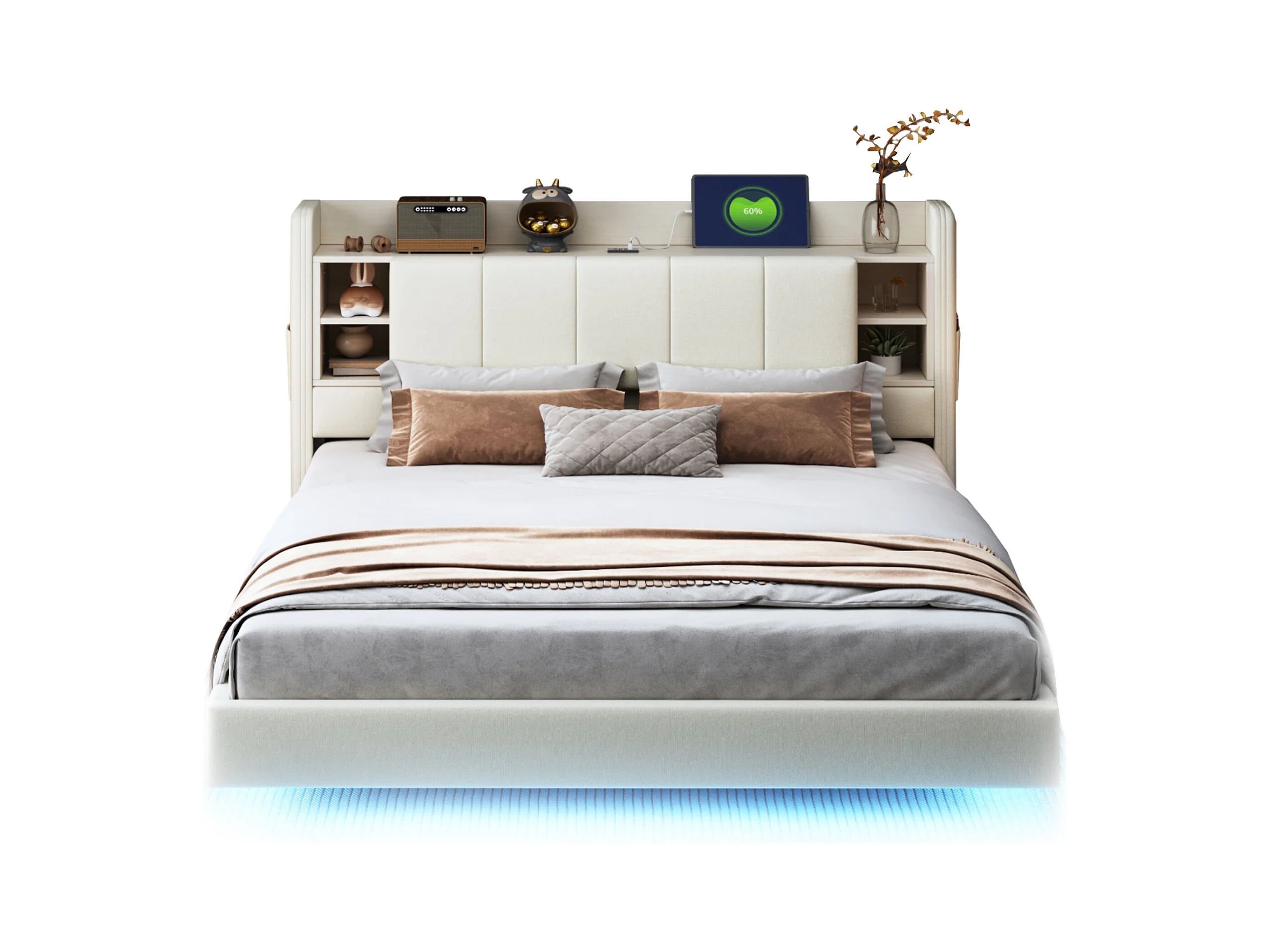 Lit adulte 160x200cm beige en lin, designe flottant avec LED et USB, tête de lit de rangement, sans matelas