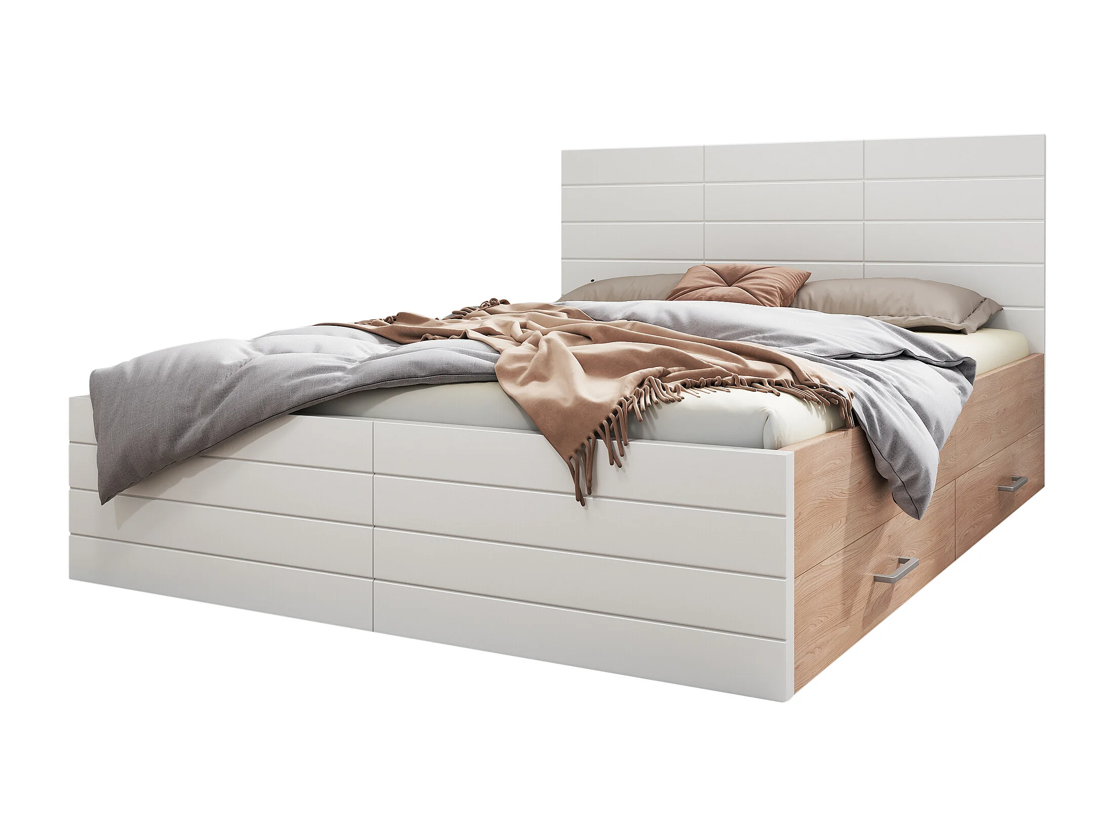 Lit 140x200 avec 2 tiroirs, avec sommier à lattes, rangement sous le lit, bois et MDF, blanc et chêne clair (Sans matelas)