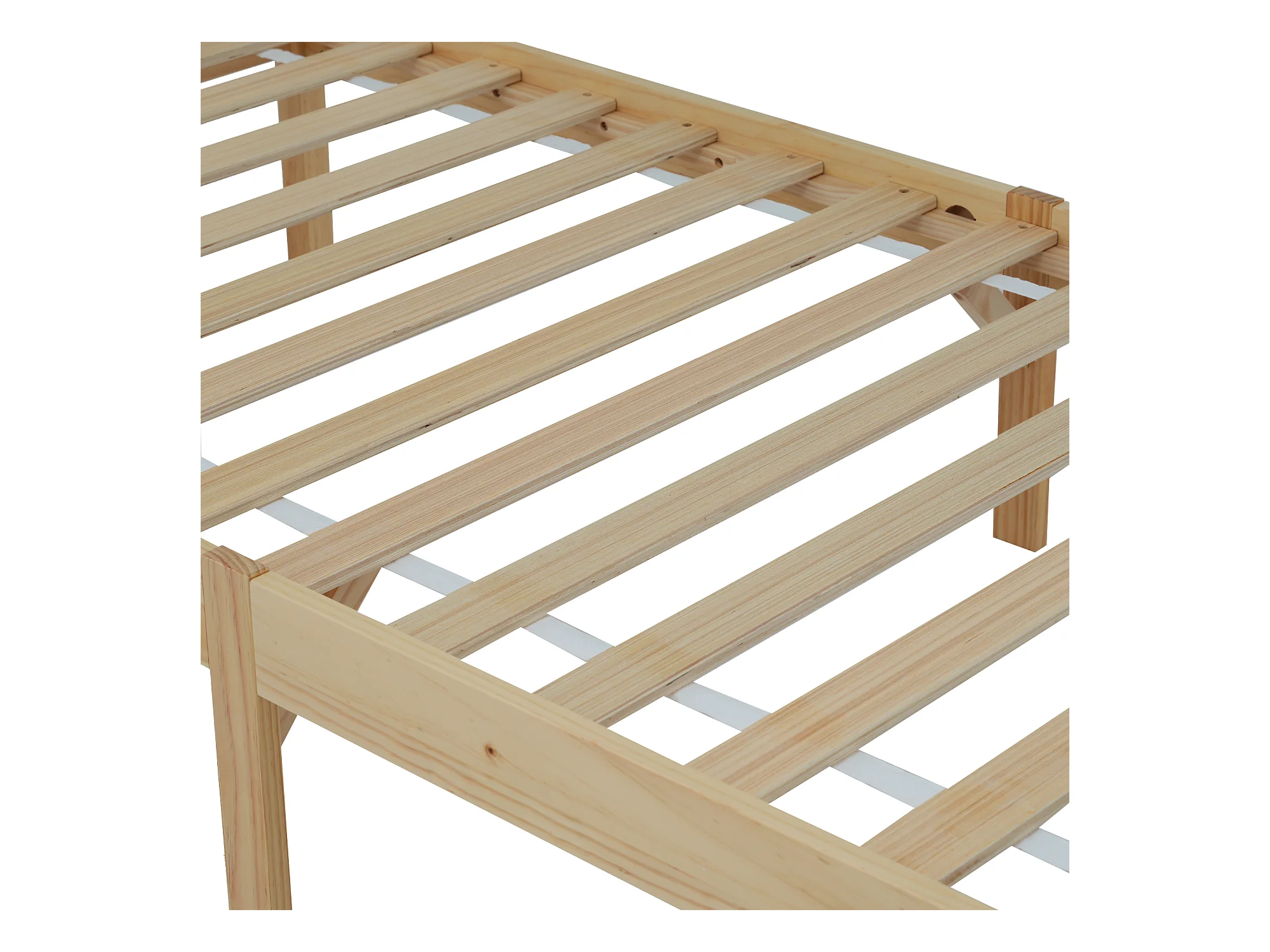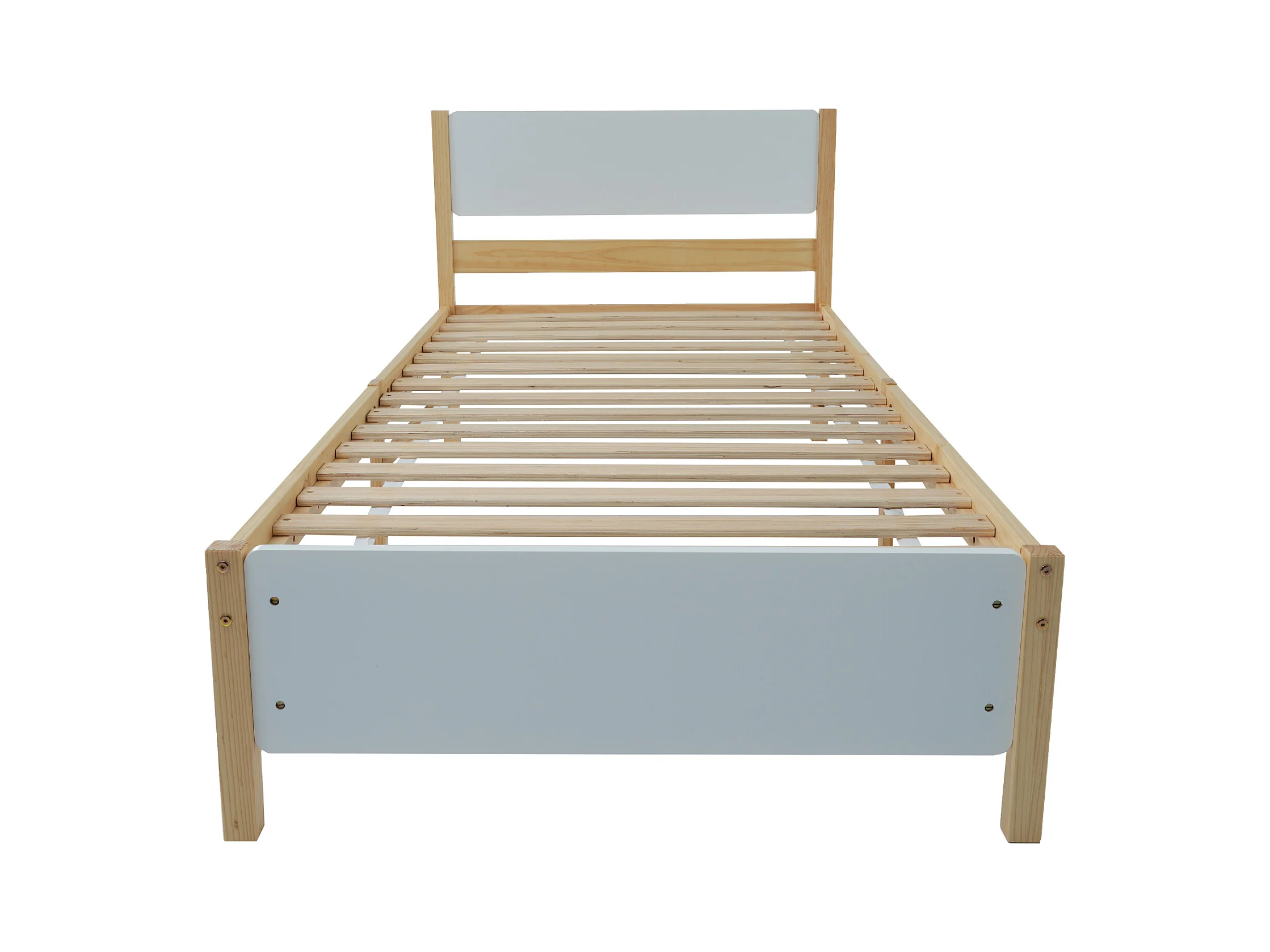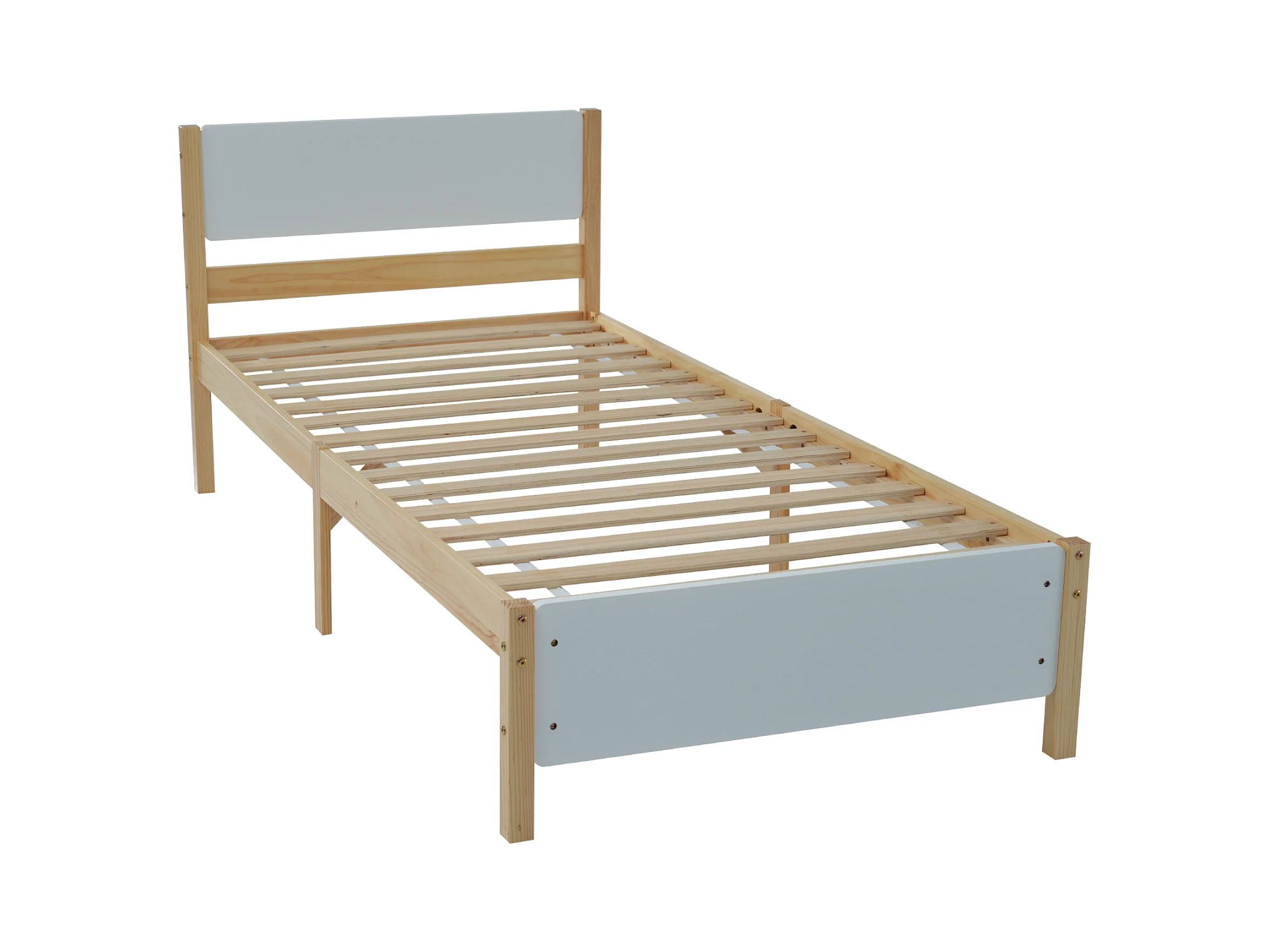 Lit adulte 90x200 cm, lit simple, cadre en bois de pin + MDF, blanc + naturel, sans matelas