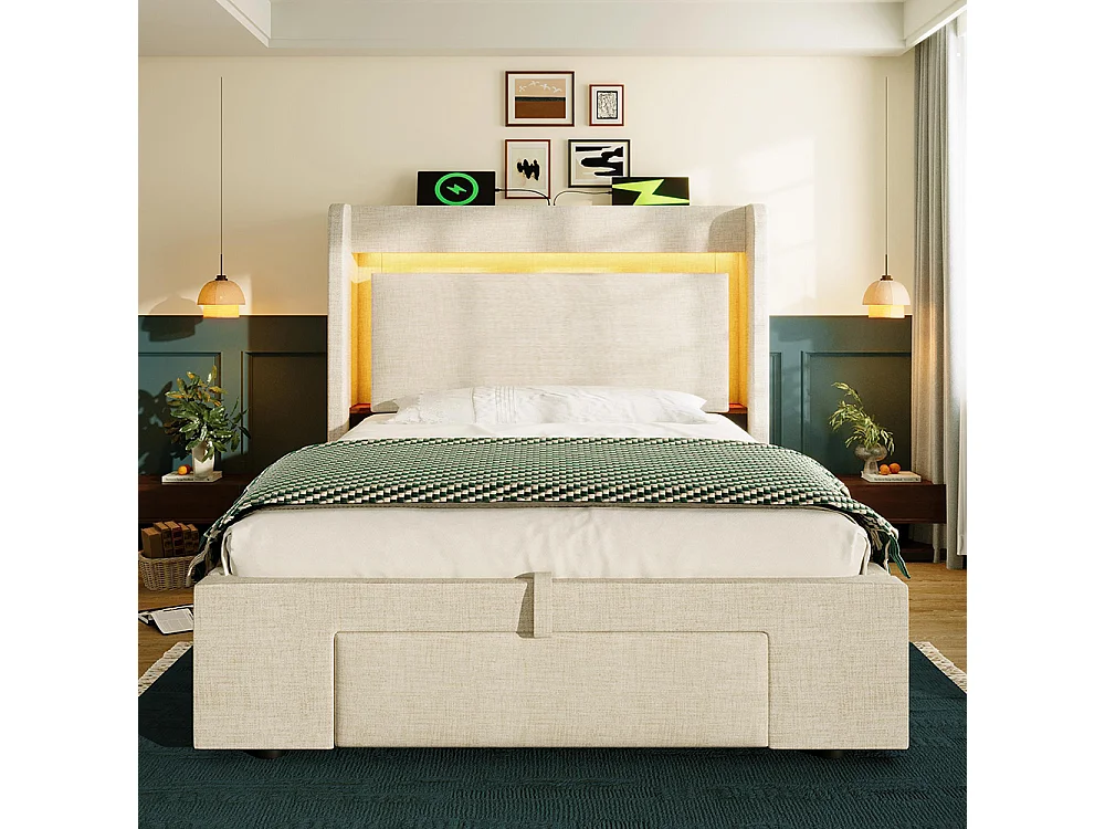 Lit adulte avec rangement hydraulique et compartiment de rangement, éclairage LED et ports USB et USB-C, beige, lin - 90x200 cm