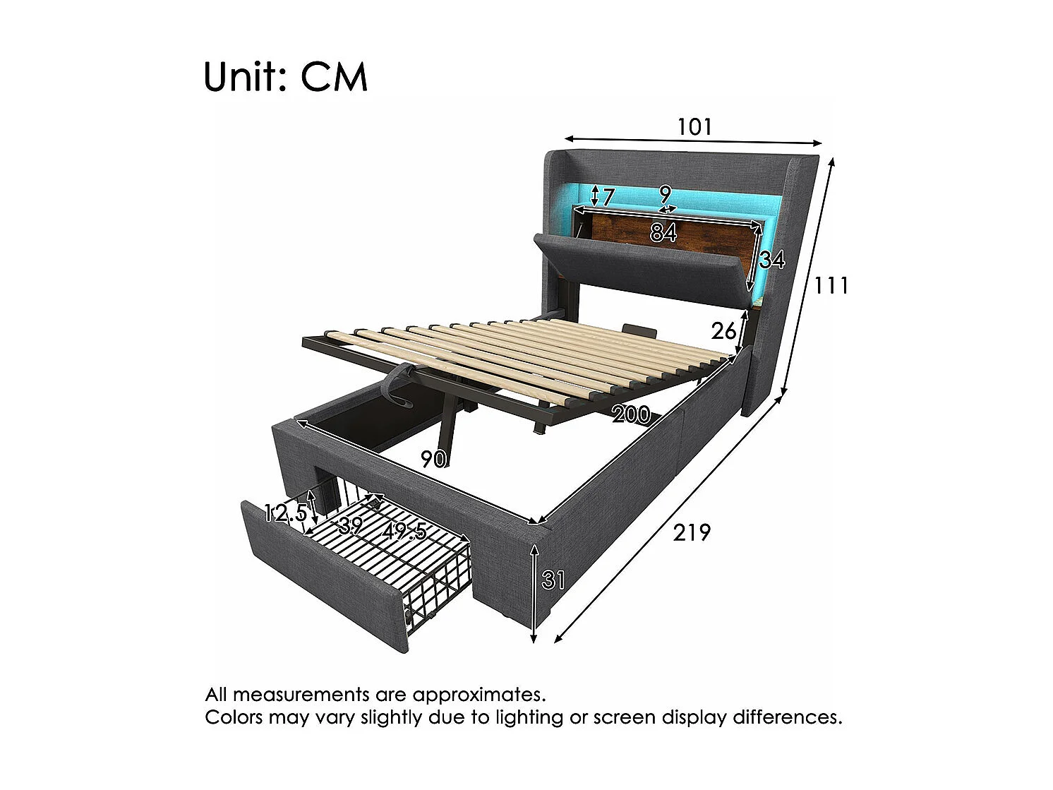 Lit adulte avec rangement hydraulique et tête de lit avec compartiment de rangement, éclairage LED et ports USB et USB-C, lin, gris - 90x200 cm