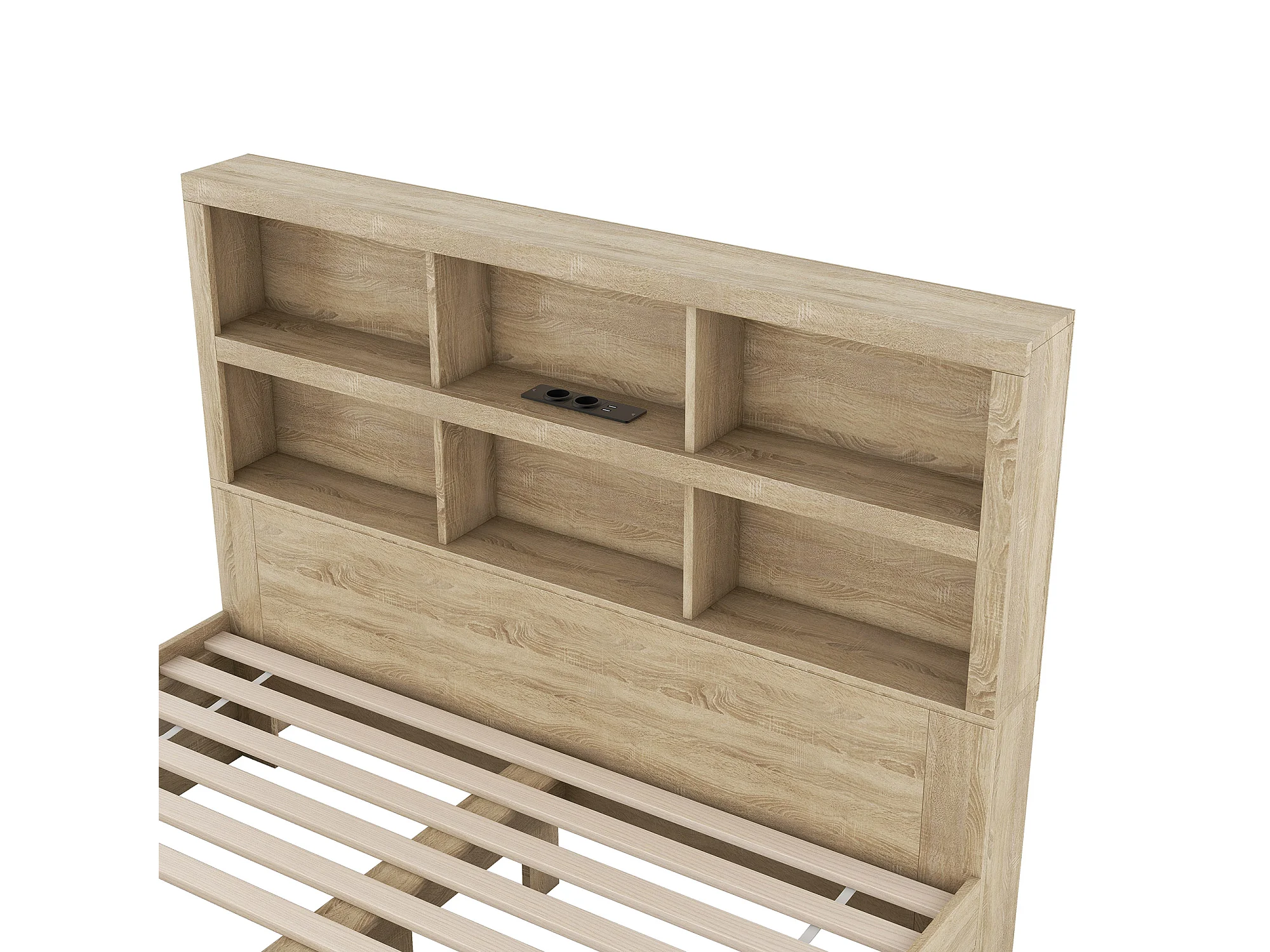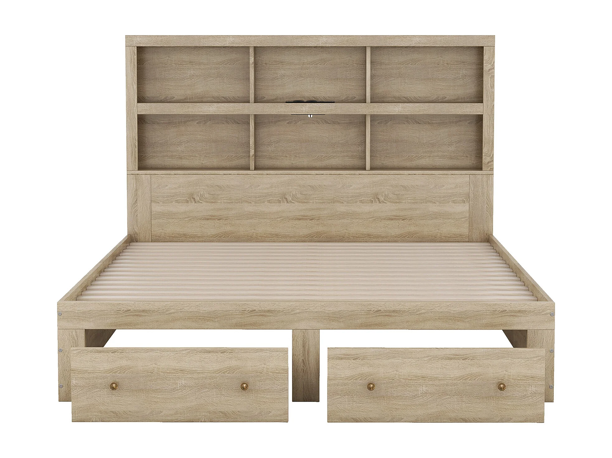 Lit double 160x200cm en bois massif avec tiroirs et tête de rangement - sommier à lattes - Naturel