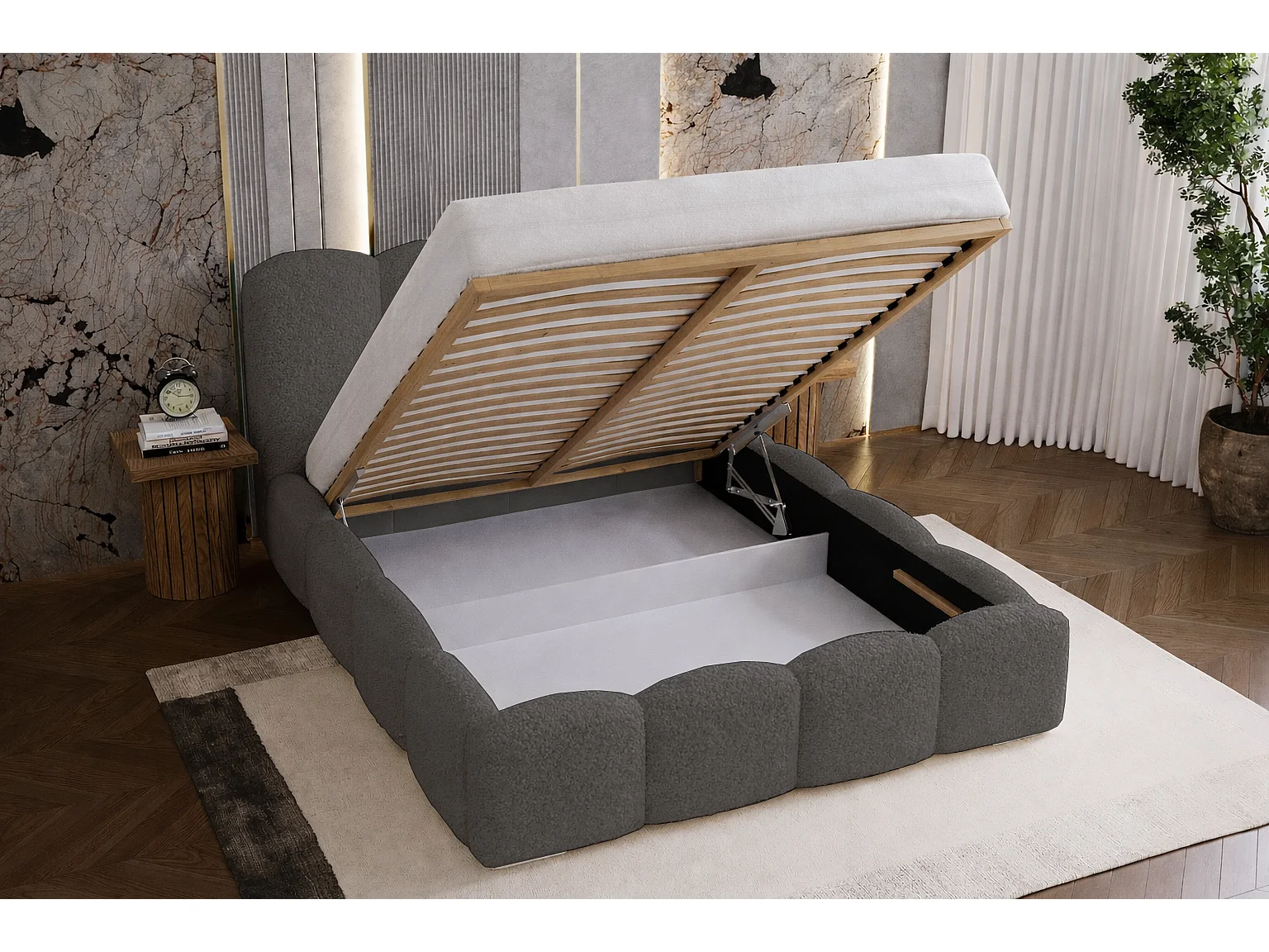 Lit adulte bouclé 160x200 Zenna - coffre de rangement, sommier - Gris (Lambi 12)